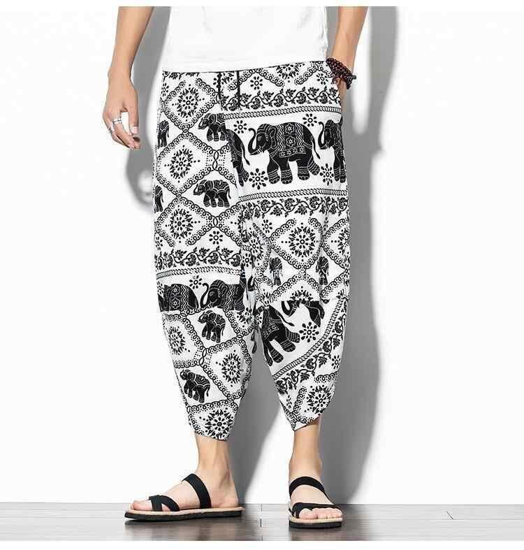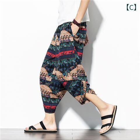 サルエルパンツ メンズ 七分丈 クロップド丈 ワイドシルエット バルーンシルエット 大きいサイズ ビッグサイズ ゆったり リラックスフィット エスニック ゾウ柄 総柄 綿麻 コットンリネン 薄手 通気性 夏 普段使い ルームウェア