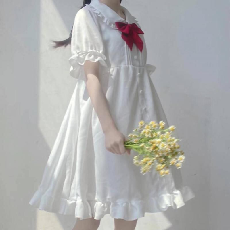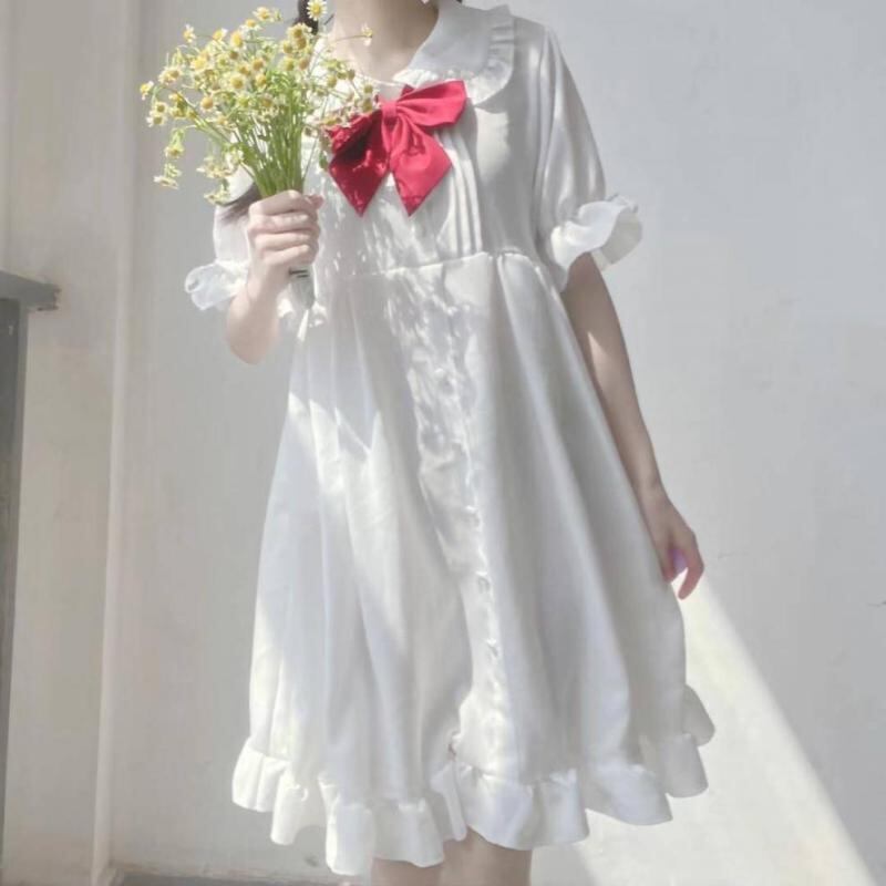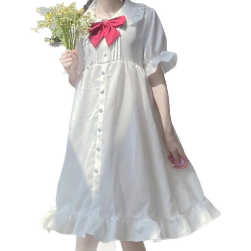 ワンピース レディース ロリータ ドレス ドールカラー 丸襟 リボン フリル ラッフル 半袖 無地 ポリエステル 春夏 ミディ丈 フレア Aライン ボリューム かわいい ガーリー ゆめかわ フェミニン 清楚 普段使い デート お出かけ お呼ばれ