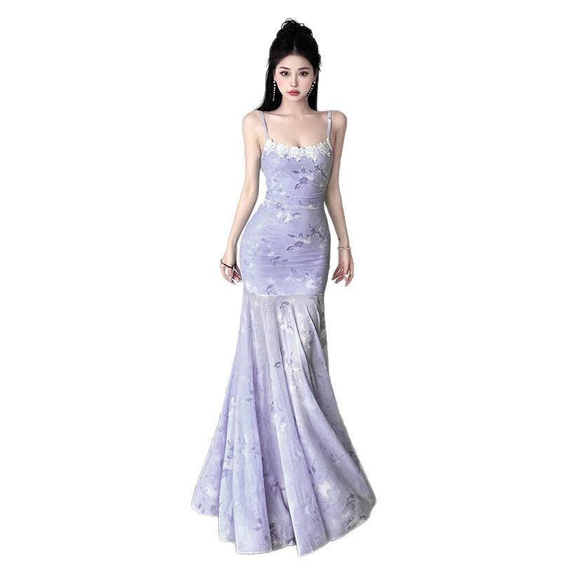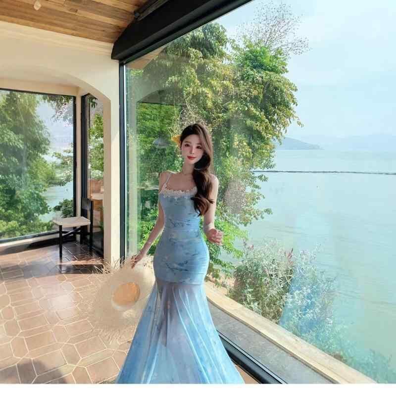 ワンピース レディース レース 切替 キャミソール ハイウエスト ウエストシェイプ 小花柄 プリント シアー メッシュ マーメイド ロング丈 エレガント 若見え ポリエステル 通勤 オフィス ラベンダー ブルー