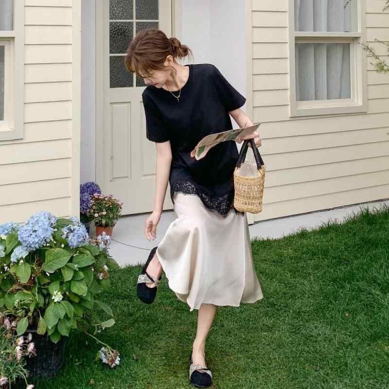 ワンピース レディース フェイクツーピース ドッキング レース切り替え Tシャツワンピース きれいめ 上品 エレガント 細見え スタイルアップ フレンチテイスト ラウンドネック 半袖 Aライン ハイウエスト ポリエステル ブラック