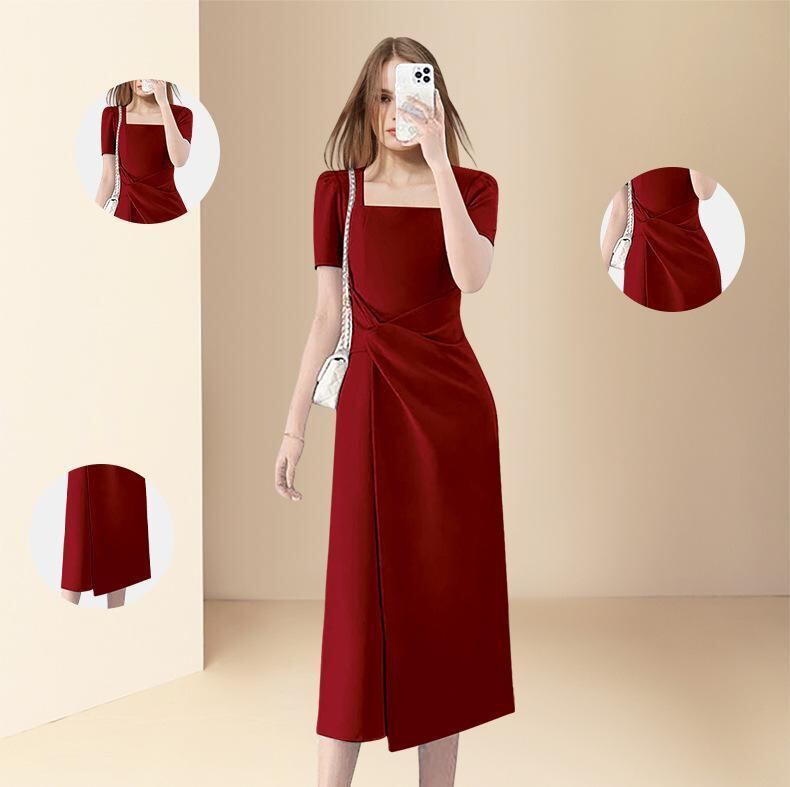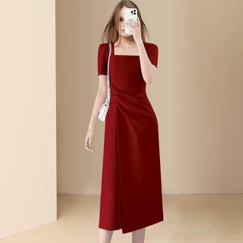 ワンピース レディース レッド 半袖 スクエアネック ミディ丈 フレンチ エレガント 上品 高級感 ハイウエスト Aライン 通勤 オフィス きれいめ お出かけ ポリエステル 無地