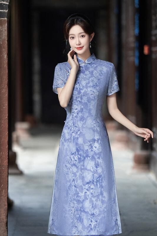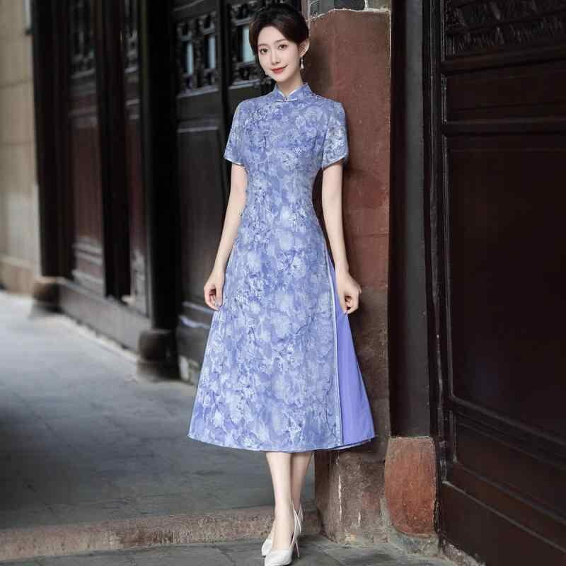 チャイナドレス レディース チャイナ服 ワンピース 新中国風 モダン レトロ 改良 ロング丈 普段使い お出かけ ポリエステル 湖水色 スタンドカラー 斜め襟 半袖 低めスリット