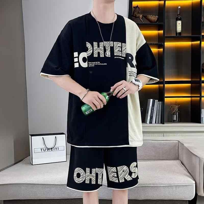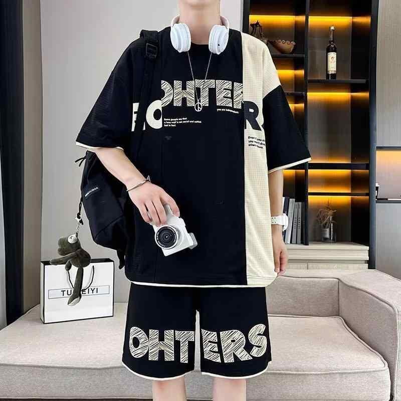 セットアップ メンズ 学生 半袖 Tシャツ ショートパンツ フェイクレイヤード 夏 トレンド カジュアル スタイリッシュ 通学 普段使い ポリエステル 薄手 上下セット ホワイト ブラック ブラウン