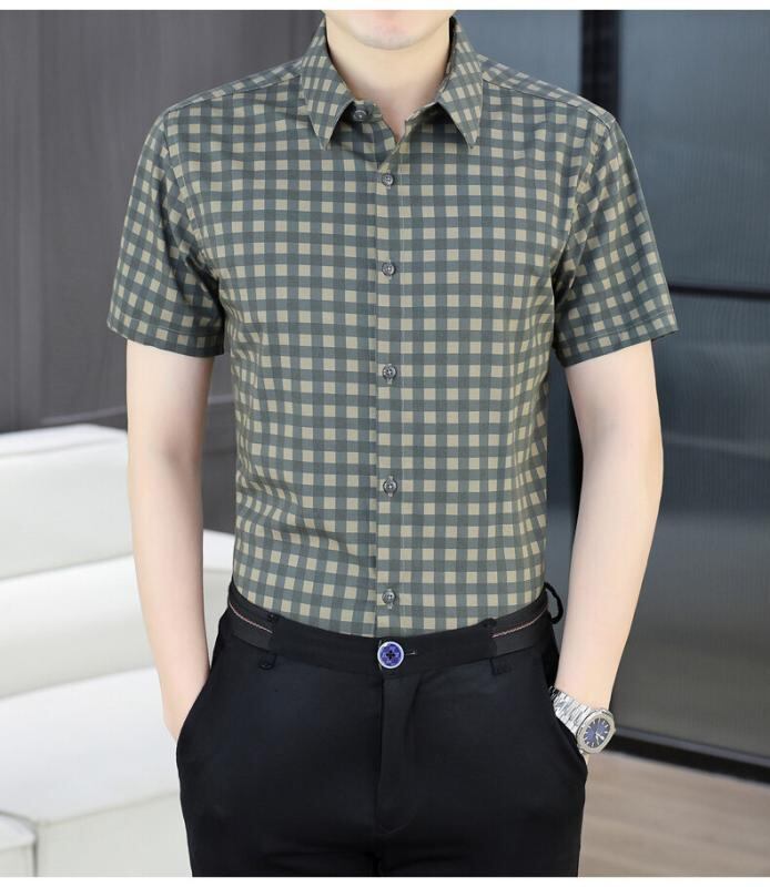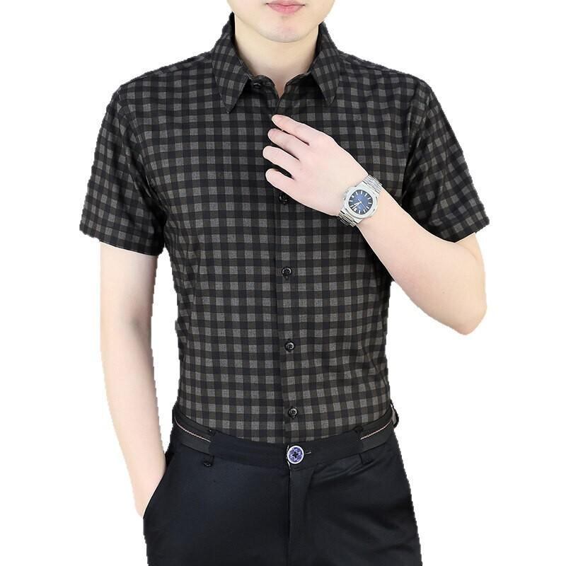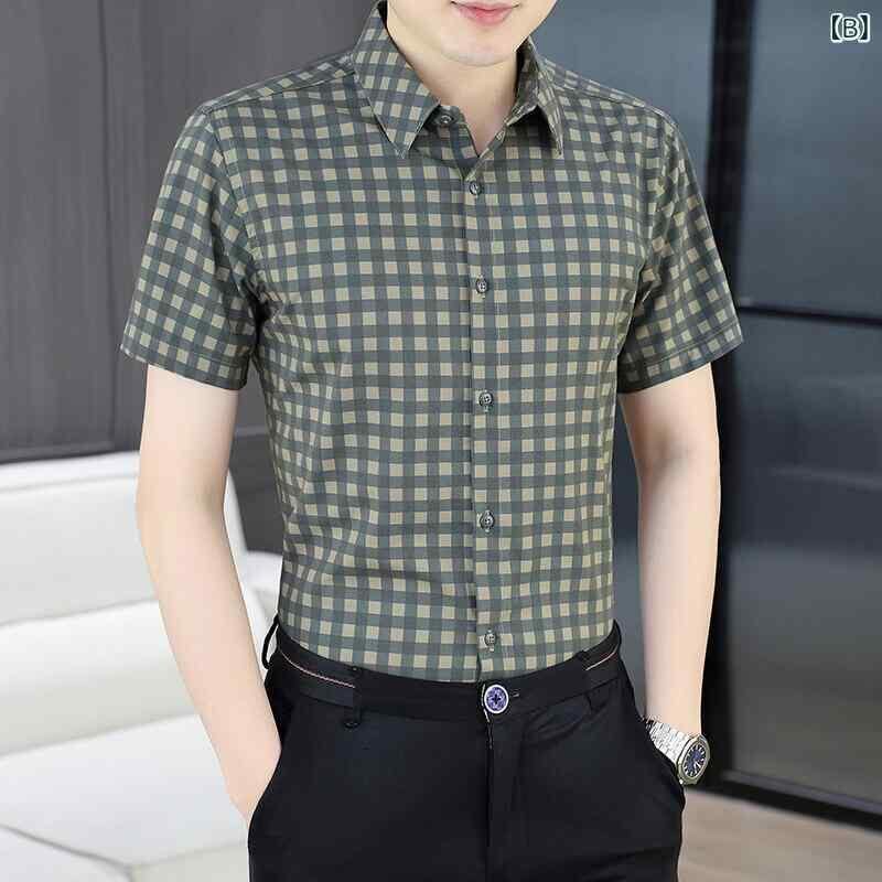 シャツ メンズ 半袖 チェック柄 ポリエステル 通気性 吸湿速乾 軽量 薄手 夏服 男性用 トップス カジュアル ビジネス 普段使い 通勤 オフィススタイル 黒 灰緑 ブラウン