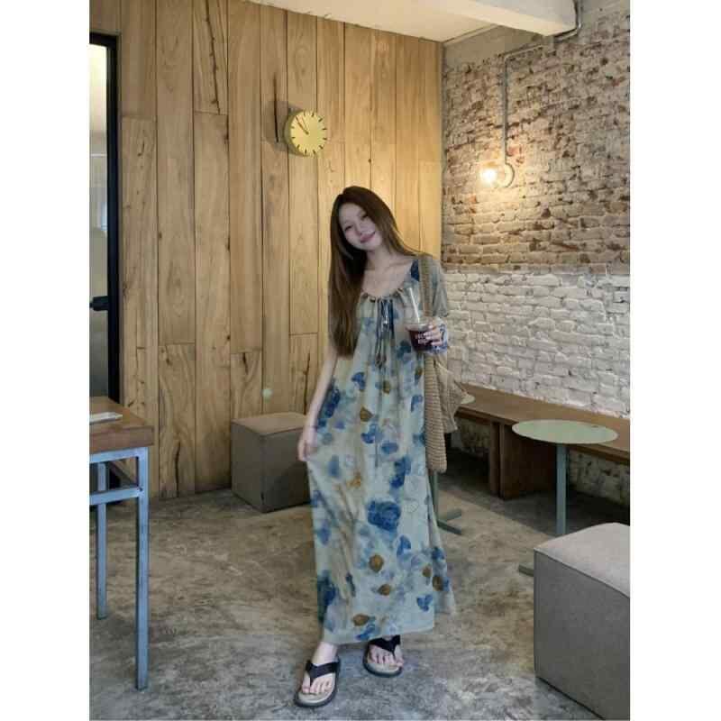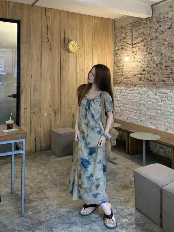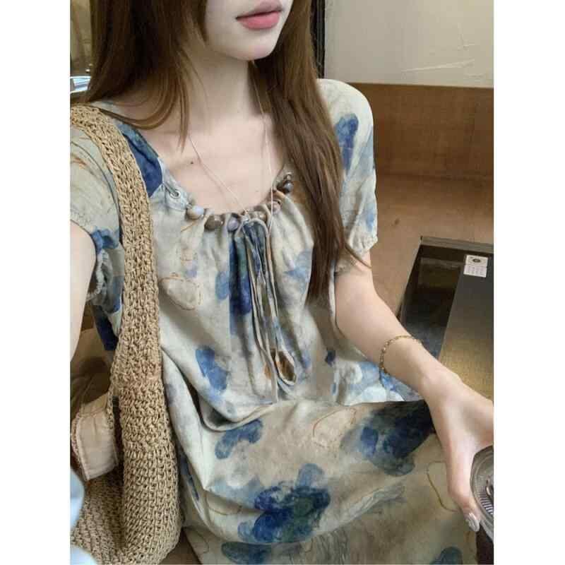 ワンピース 大きいサイズ レディース ゆったり リラックス 新中華風 レトロ 染め柄 半袖 エレガント 上品 ロング丈 Aライン ラウンドネック PVC素材