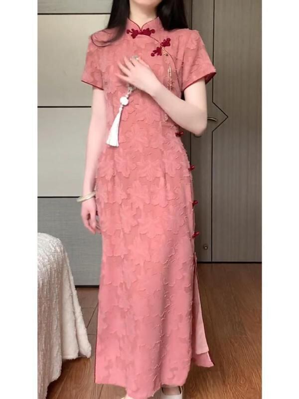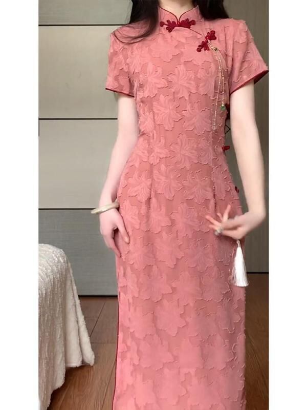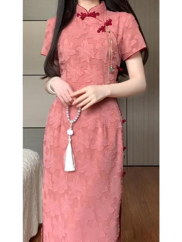 ワンピース 大きいサイズ レディース 新チャイナ風 改良版 レトロ エレガント チャイナドレス 華やか Vネック Aライン ロング丈 長袖 ミドルウエスト ローズレッド