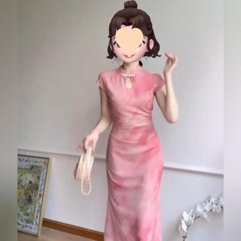 チャイナ風ワンピース 女性用 ピンク 中国風 ウエスト絞り 細見え ロング丈 ヒップライン強調 優雅な佇まい 大人の魅力あふれる プラスサイズ 体型カバー 夏物