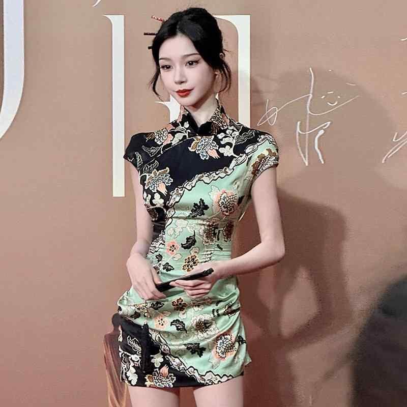 ワンピース レディース 新中華風 改良チャイナドレス タイト ミニ丈 半袖 Aライン ハイウエスト ボタンネック 3Dプリント柄 エレガント 上品 再生繊維 ポリエステル スパンデックス 夏