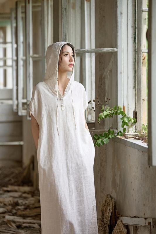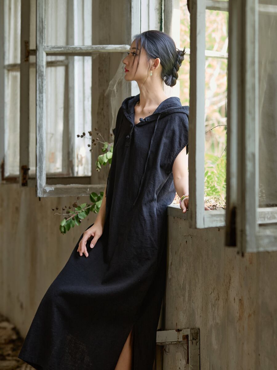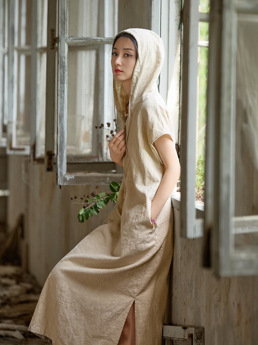 ワンピース レディース 綿麻 ラミー フード付き 半袖 Aライン ロング丈 プルオーバー サンドウォッシュ加工 ビンテージ風 無地 清涼感 ナチュラル 禅風 リラックス オリジナル デザイナーズ