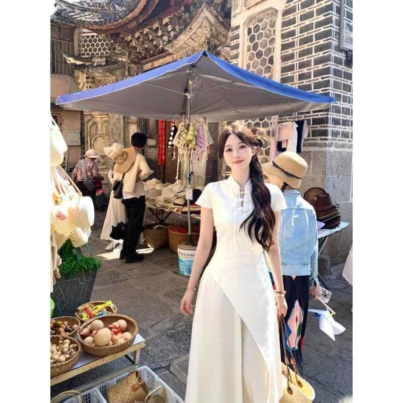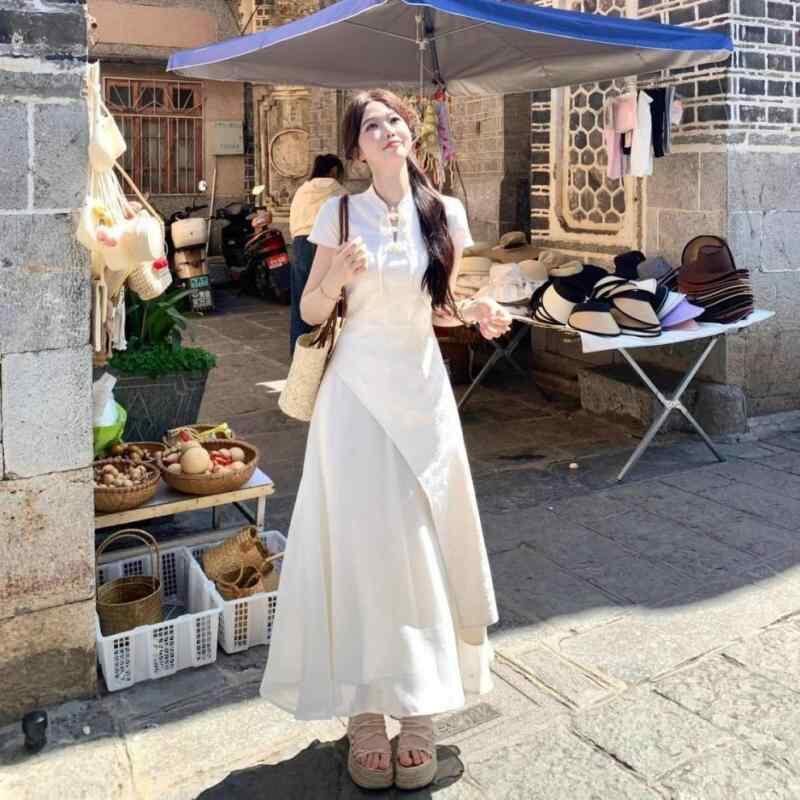 ワンピース レディース 半袖 Aライン ロング丈 改良チャイナドレス 中国風 チャイナボタン 着痩せ 上品 エレガント リネン 立ち襟 ホワイト