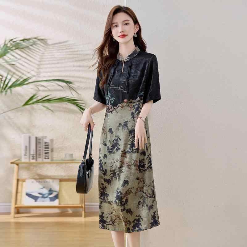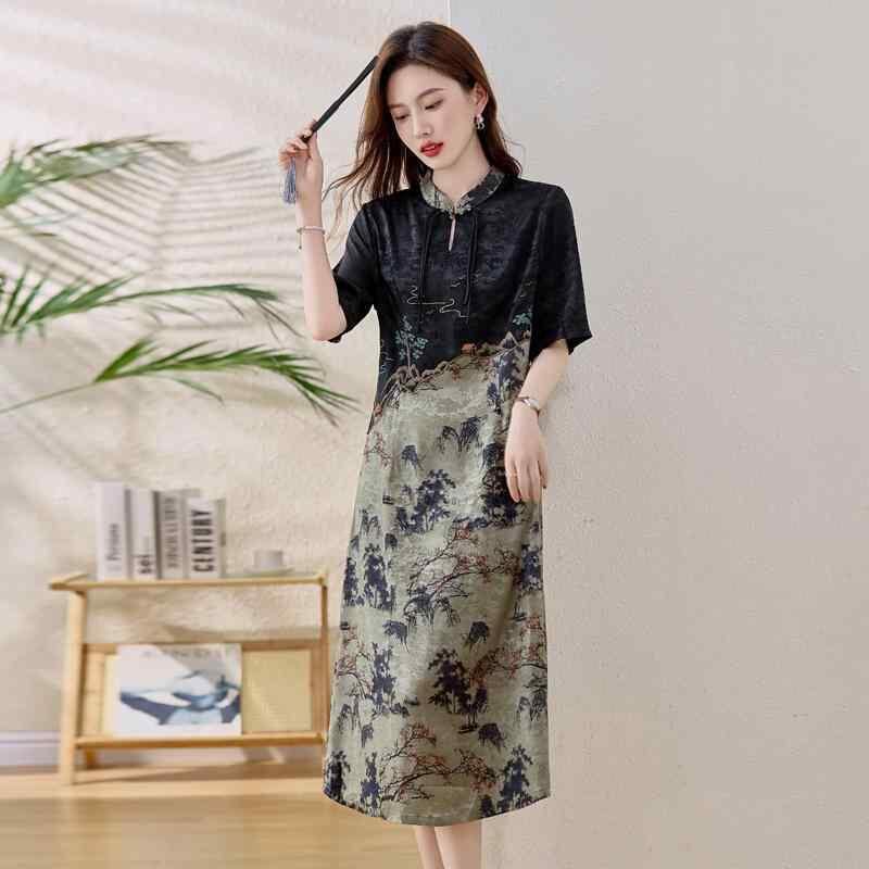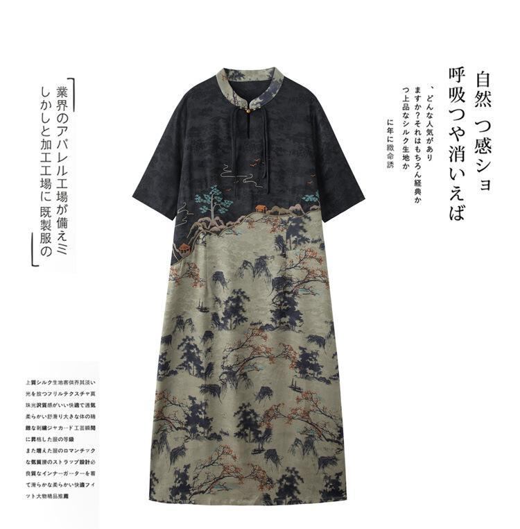 ワンピース レディース 中華風 エスニック 花柄 刺繍 薄手 軽量 ゆったり リラックスフィット エレガント 上品 Aライン ミディ丈 ラウンドネック 五分袖 ポリエステル ブラック カーキ