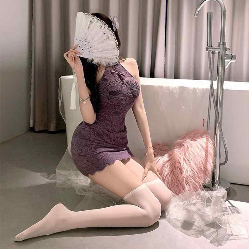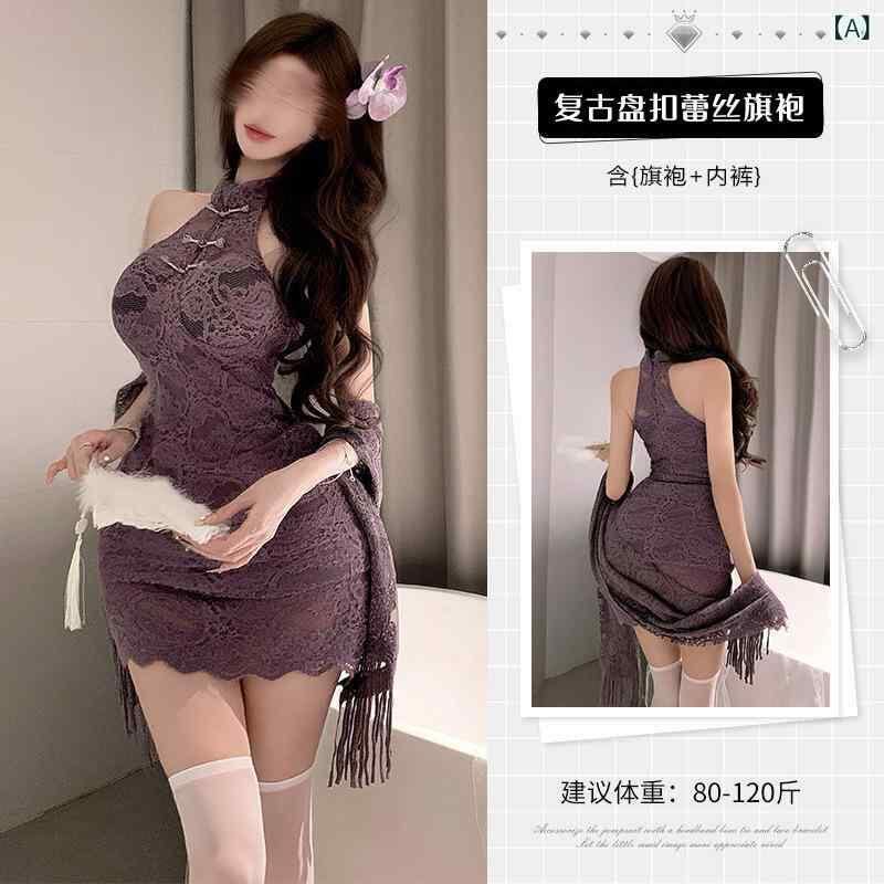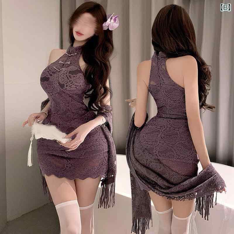 ルームウェア レディース ホルターネック ワンピース セクシー チャイナドレス風 レース シースルー 薄手 Aライン パープル ショート丈 羽織り カーディガンセット ポリエステル 快適 おうち時間 ワンマイルウェア