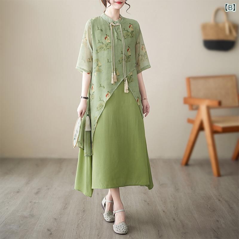 ワンピース レディース 大きいサイズ 新チャイナスタイル チャイナドレス レトロ ウエストマーク ロング丈 半袖 スタンドカラー Aライン デザイン チャイナボタン プリント柄 2点セット トレンド カーキ グリーン