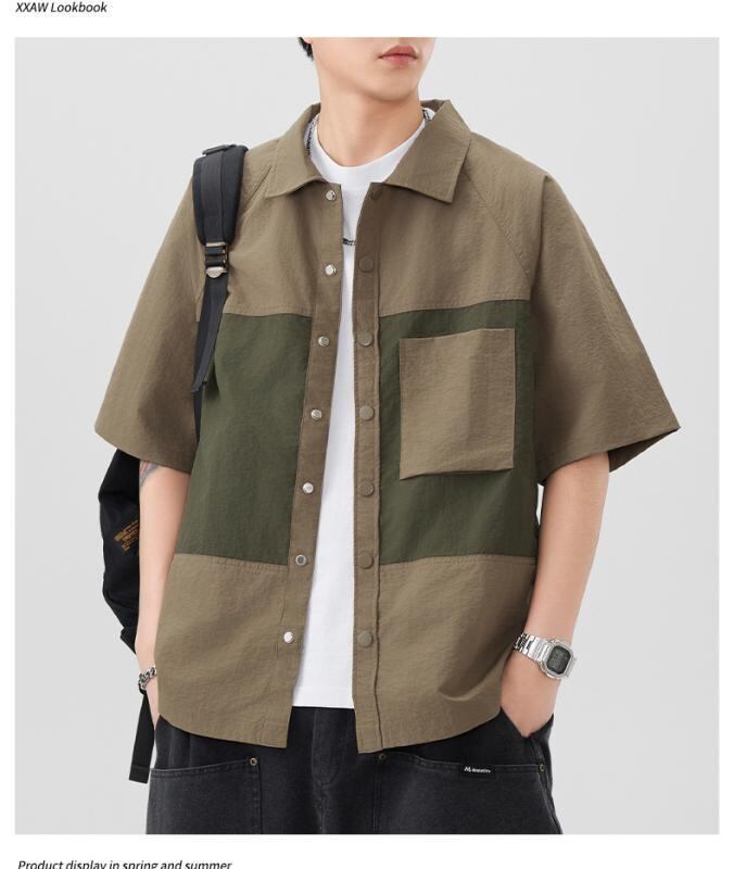 シャツ メンズ 半袖 ゆったり ルーズフィット 切り替え 配色 ワーク マウンテン アウトドア レトロ アメカジ 高級感 ナイロン 通気性 吸湿速乾 開襟 襟付き 普段使い カジュアル カーキ ダークグレー チャコールグレー