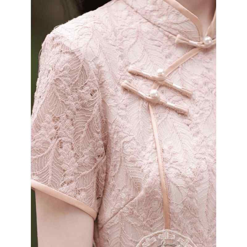チャイナドレス レディース ピンク 改良チャイナワンピース アオザイスタイル エレガント 上品 ゆったり 体型カバー 大きいサイズ ロング丈 普段使い デイリー スタンドカラー 斜め襟 フリルスリーブ ポリエステル レース 微ストレッチ