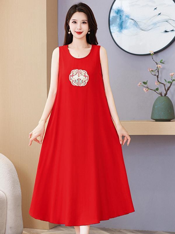 ワンピース レディース 中国風 エスニック 刺繡 高級感 ロング丈 キャミソール ノースリーブ ゆったり 大きいサイズ 体型カバー 普段使い リゾート レッド ブラック ホワイト パープル イエロー ポリエステル 綿紬風