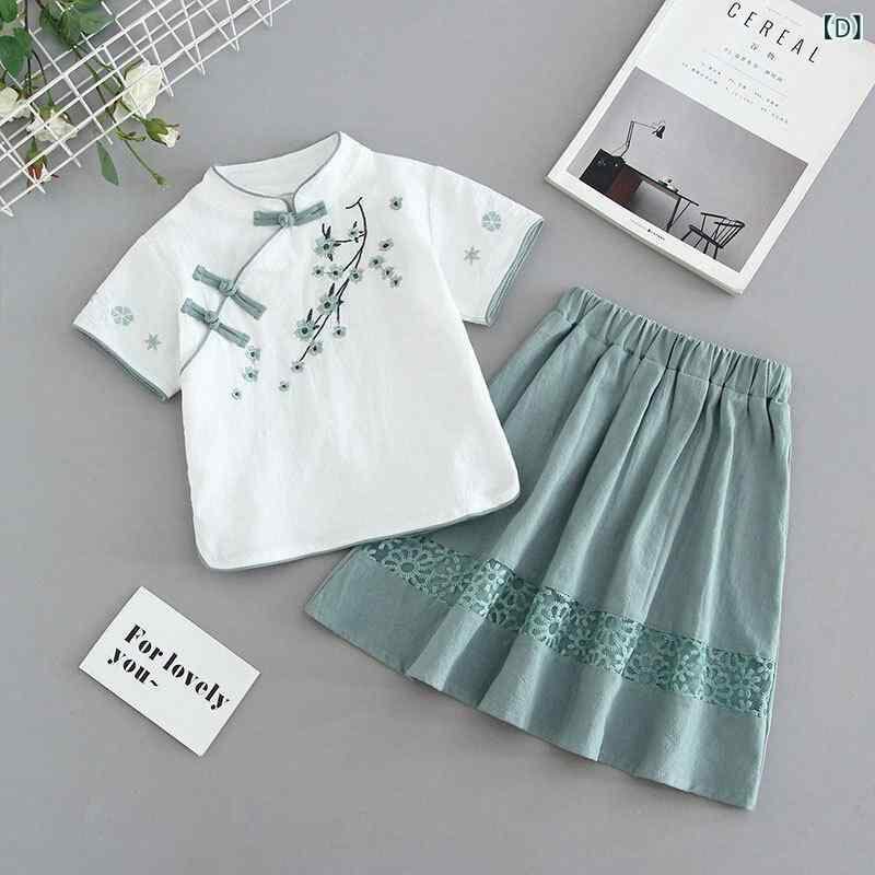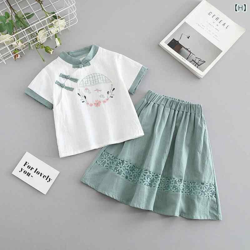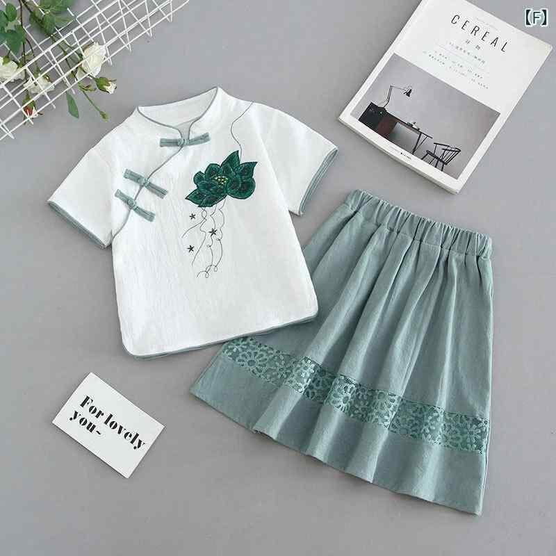 キッズ 女の子 ベビー 子供服 チャイナ風 中華風 セットアップ 上下セット 漢服 唐装 綿麻 コットンリネン 花柄プリント 薄手 軽量 柔らかい 夏服