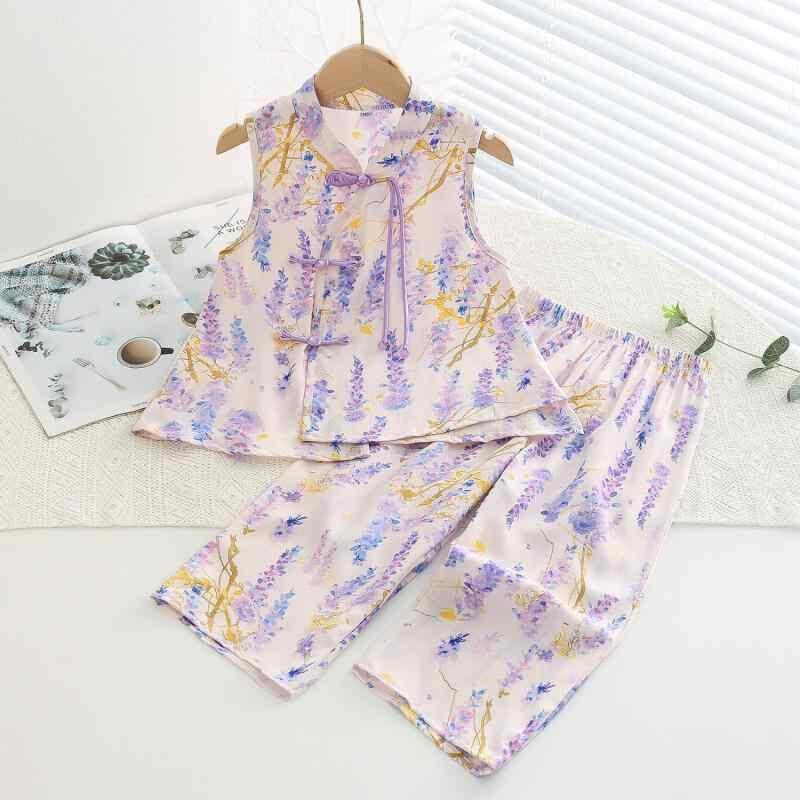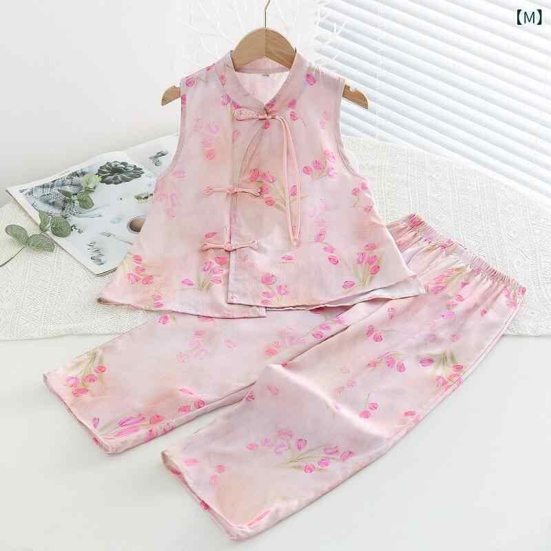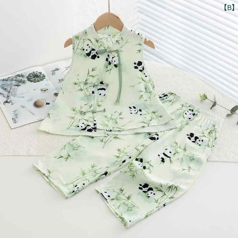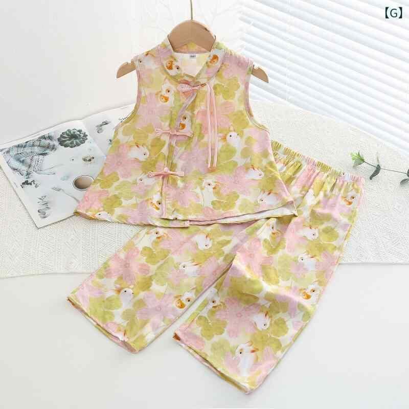 子供服 女の子 ベビー キッズ 再生繊維 接触冷感 ノースリーブ 漢服風 唐装風 国風 スカート セットアップ 薄手 夏服 普段着 2点セット