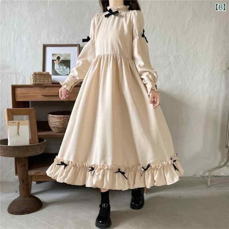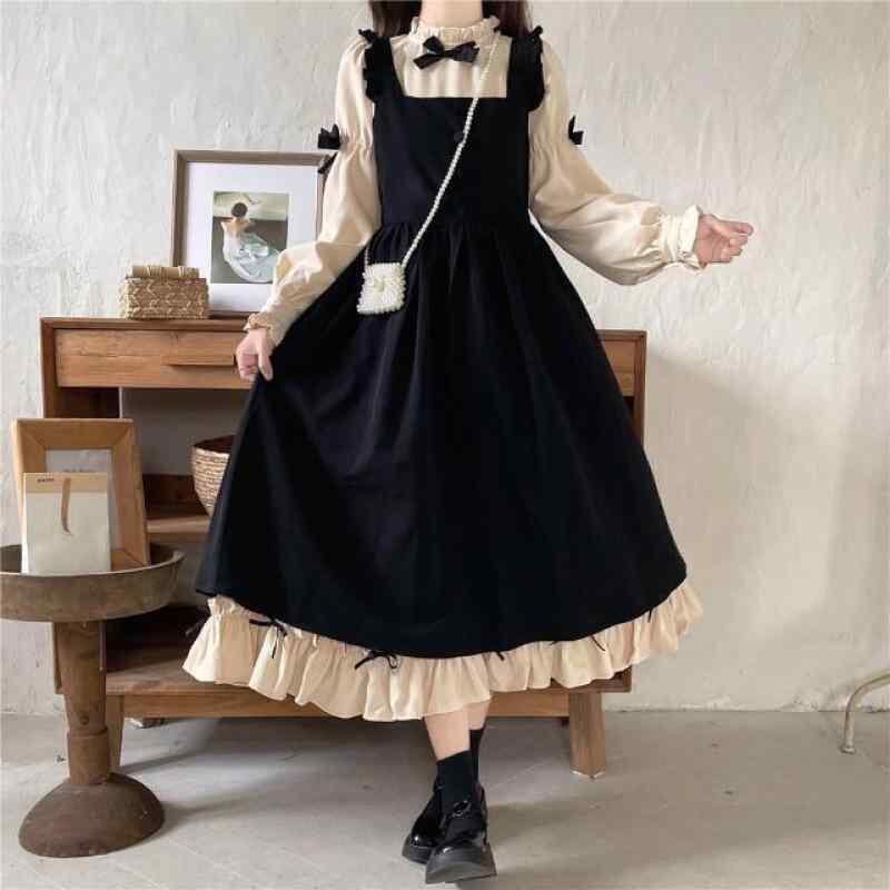 ワンピース 女の子 低身長 ジャンパースカート ブラック 2点セット コーデュロイ 綿 コットン Aライン リボン 長袖 ラウンドネック ミモレ丈 スクール風 フレンチ ロリータ カジュアル 学生向け