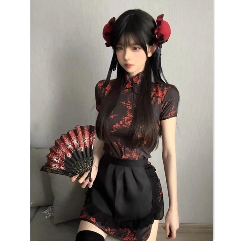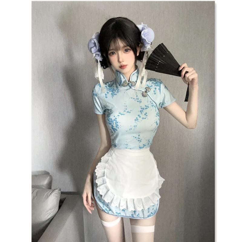 ワンピース レディース チャイナドレス 新中式 改良デザイン ロリータ風 メイド服 エプロン付き コスプレ衣装 仮装 イベント かわいい ドレス シェニール スパンデックス素材 水色 ピンク パープル ダークレッド