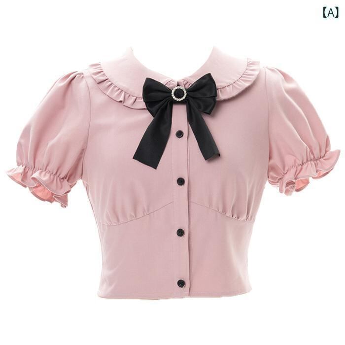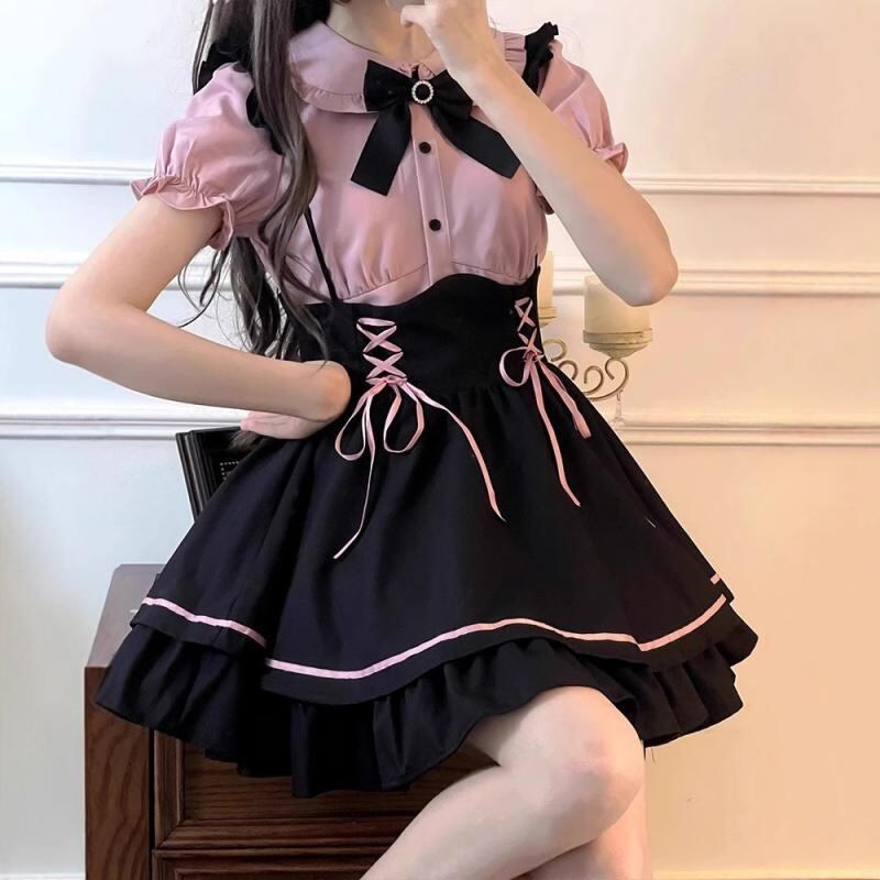 ロリータ ジャンパースカート セットアップ かわいい スウィート 清新 プリンセス風 シャツ ブラウス ポロ襟 パフスリーブ リボン 学院風 スクールガール ポリエステル お出かけ デート イベント衣装 ガーリー フェミニン ピンク