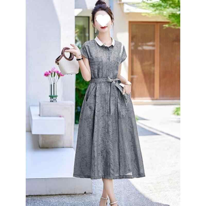 ワンピース レディース モダンチャイニーズ ジャカード 小花柄 シフォン Aライン 高級感 ウエストマーク エレガント スタイルアップ 半袖 スクエアネック ミディ丈 シャツワンピース カジュアル 普段使い