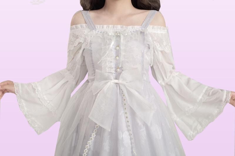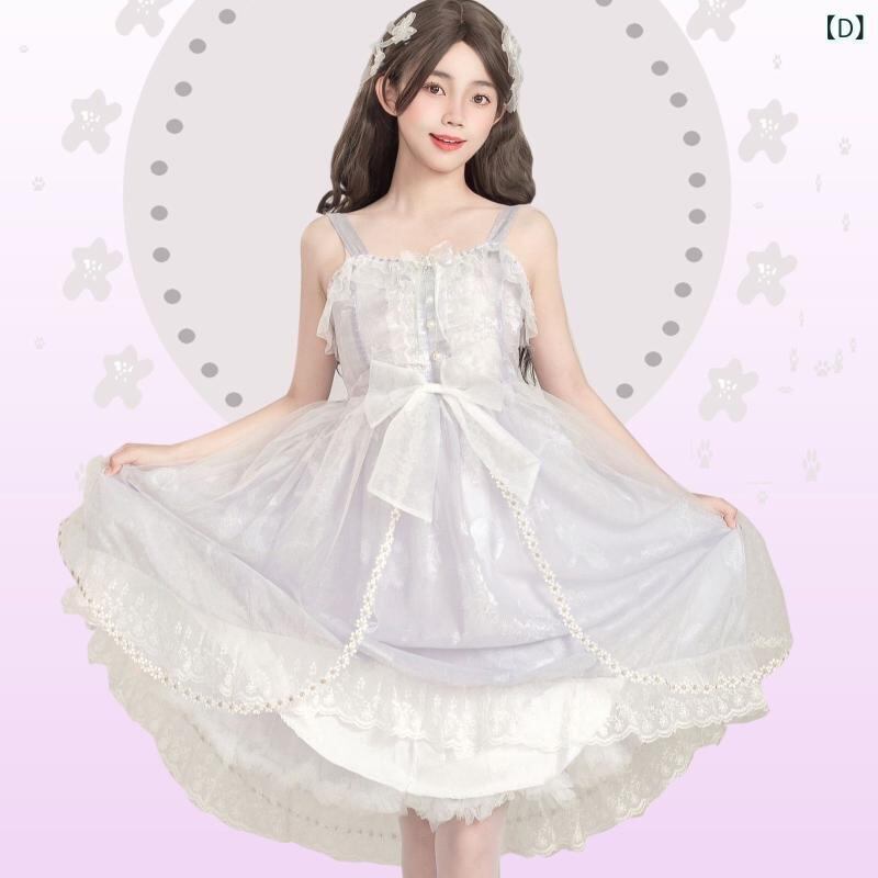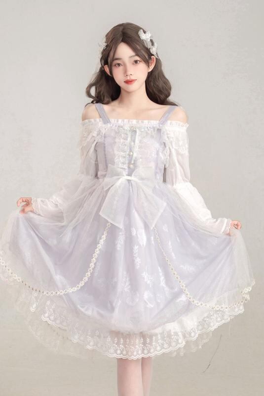 ワンピース ロリータ ジャンパースカート オリジナルデザイン 紫灰色 シアー 貝殻 ジャガード織り ミディ丈 コットン ビーズ装飾 リボン パッチワーク レトロ クラシカルスタイル