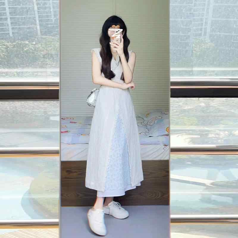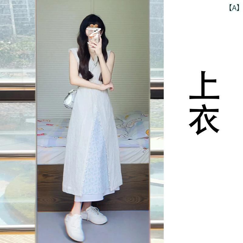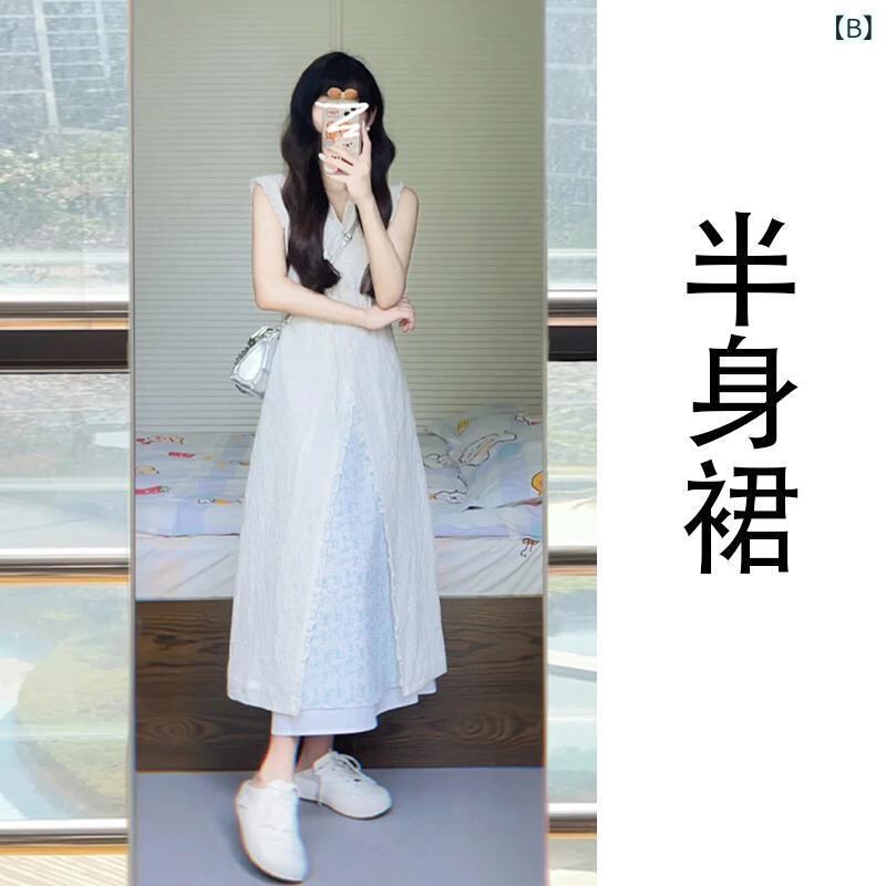 セットアップ レディース デザイン ノースリーブ ベスト ロングスカート Vネック ハイウエスト Aライン ポリエステル 夏 リゾート ビーチ 旅行 お出かけ 体型カバー 上品 フェミニン カジュアル デイリー 韓国風 おしゃれ