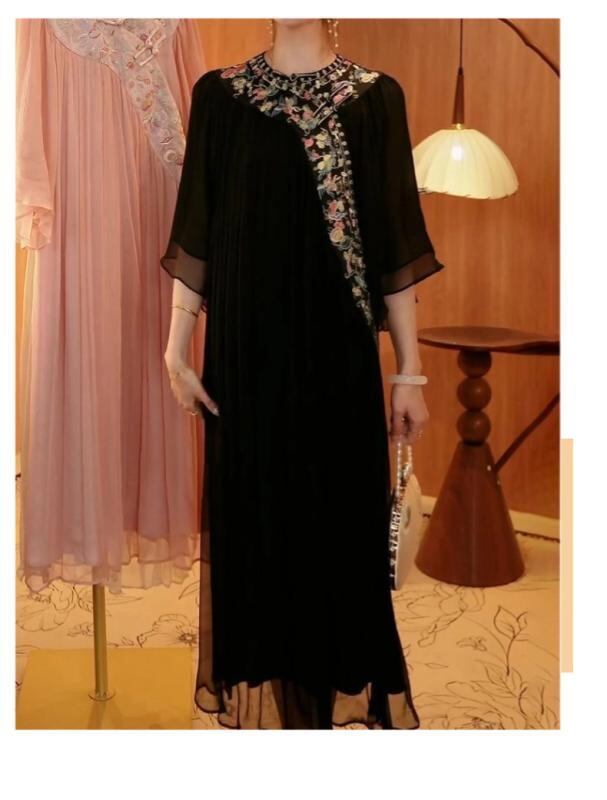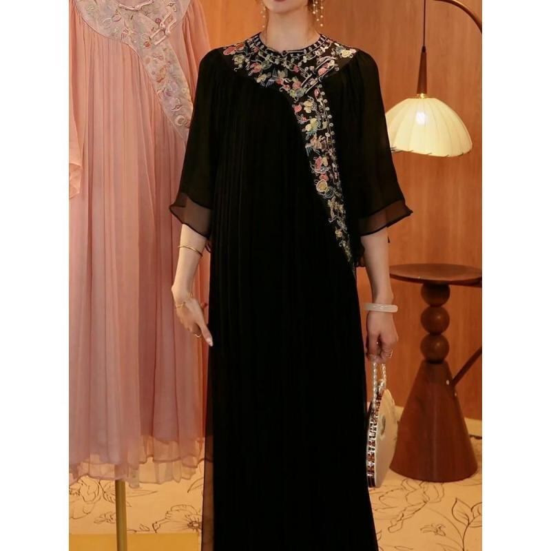 ワンピース レディース モダンチャイナ風 ラウンドネック ドルマンスリーブ 五分袖 Aライン ロング丈 エレガント 上品 きれいめ 若見え ゆったり リラックスフィット 大きいサイズ対応 ブラック ポリエステル素材 通勤 オフィス フォーマル