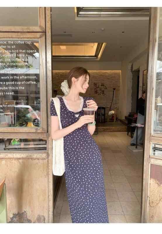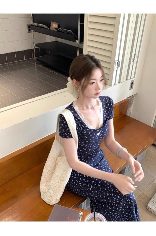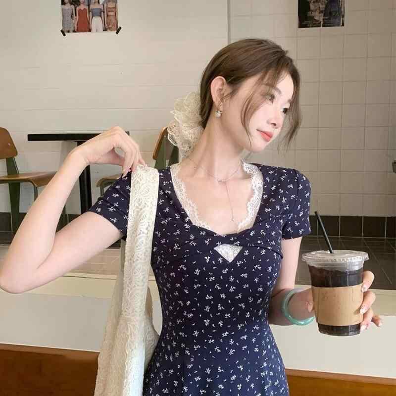ワンピース レディース フレンチ レトロ Vネック スリムフィット 花柄 着痩せ ロング丈 ハイウエスト 半袖 ネイビー 綿混 ポリエステル レース プリント ストリート カジュアル ドレス