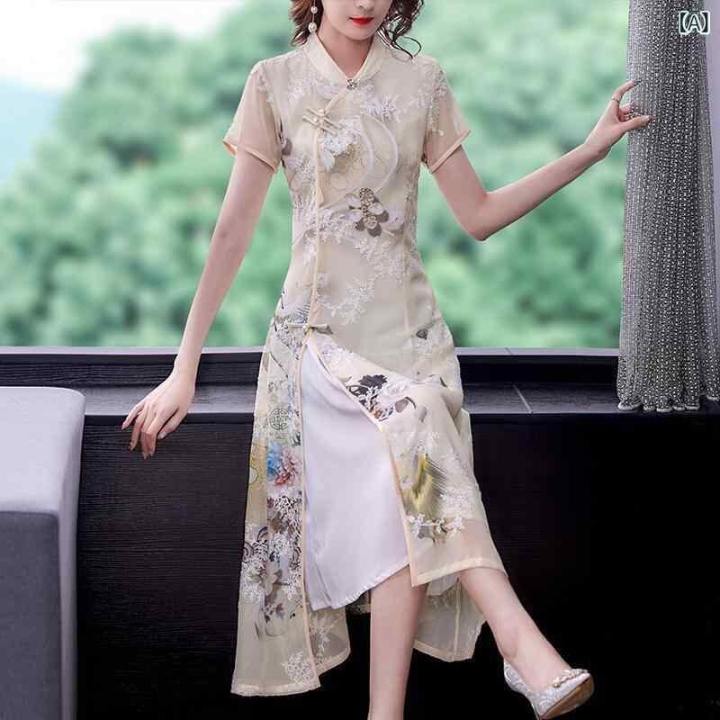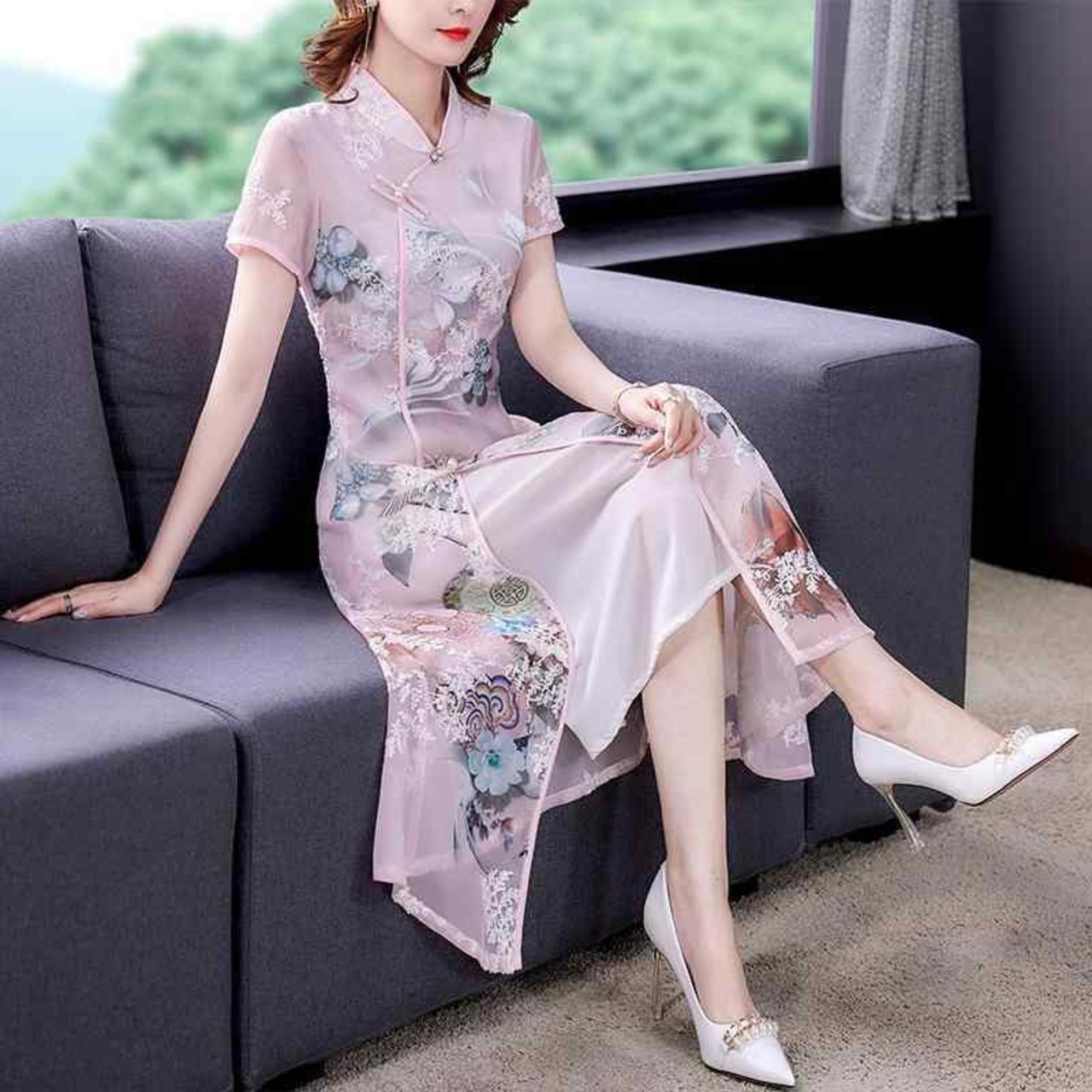 ワンピース レディース シフォン素材 刺繍デザイン 改良チャイナドレス スタンドカラー 五分袖 スリット入り ウエストマーク ミディ丈 エレガント フォーマルドレス 着痩せ効果 通勤スタイル アプリコット ピンク