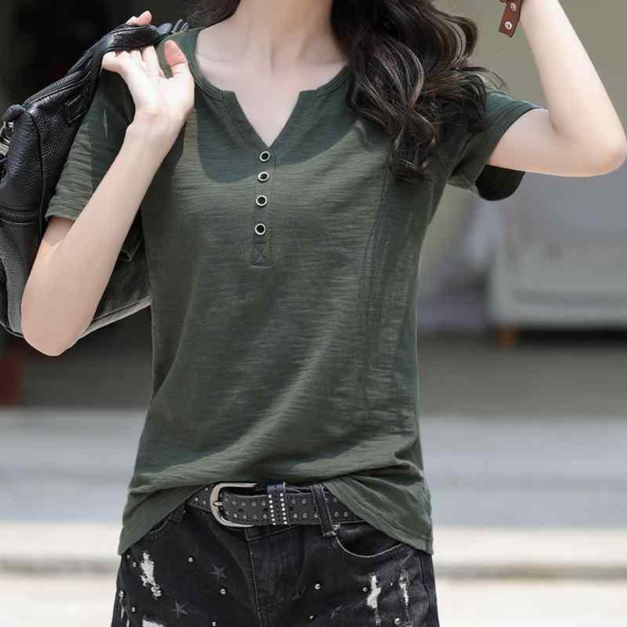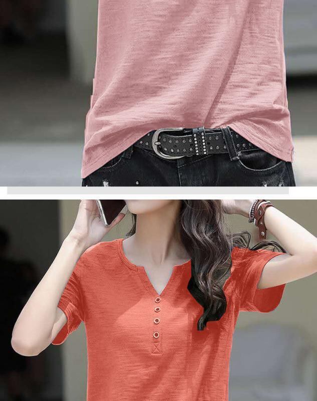 Tシャツ レディース 女性用 半袖 ゆったり ビッグシルエット Vネック 無地 コットンブレンド トップス 通勤 オフィス カジュアル 普段使い ボタン付き