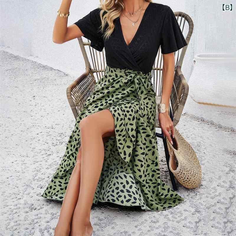 ワンピース レディース Vネック 半袖 バイカラー 植物柄 花柄 ポリエステル ストレッチ エレガント 上品 きれいめ 通勤 オフィス ミディ丈 アシンメトリー ウエストリボン