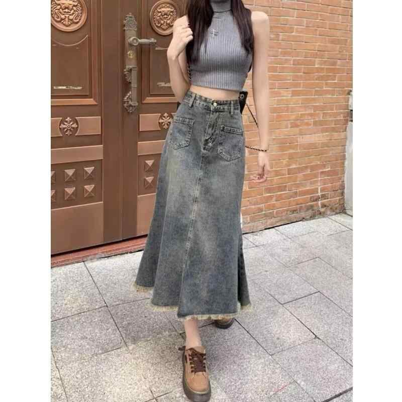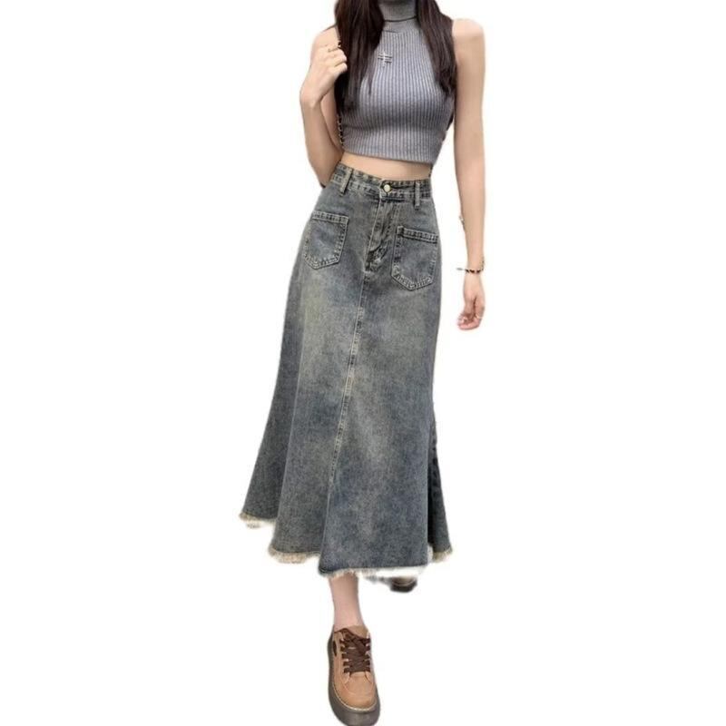 スカート レディース ハイウエスト デニム マーメイドスカート Aライン ミディ丈 大きいサイズ ゆったり 梨型体型カバー 細見え 着痩せ効果 レトロ ヴィンテージ カジュアルスタイル 上品 コットン 綿 伸縮性 ストレッチ ブルー 青