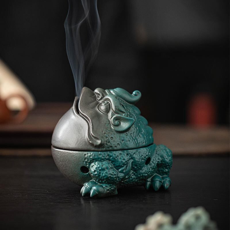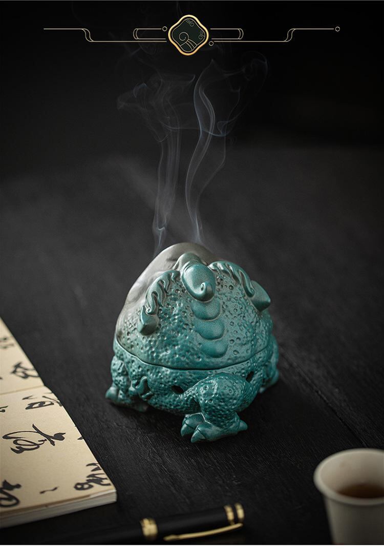 香炉 招きカエル 陶器製 縁起物 ラッキーアイテム 開運 渦巻き線香立て 卓上 インテリア 自宅用 室内用 禅風 茶室 玄関 リビング 寝室 瞑想 癒し 置物