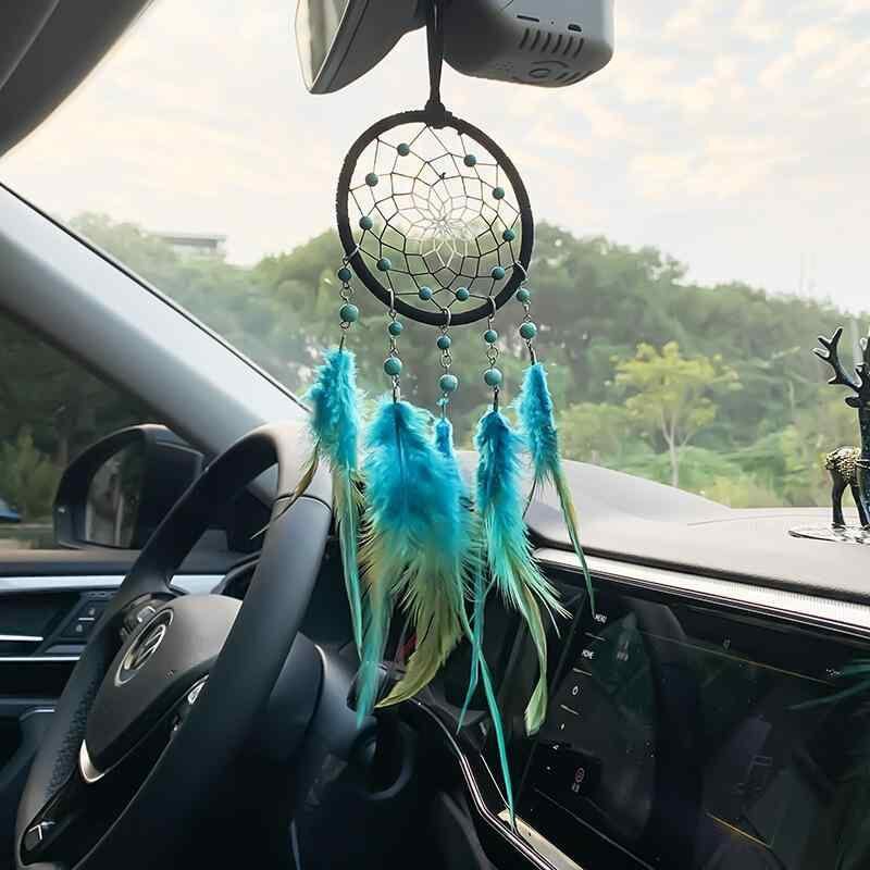 カーアクセサリー ドリームキャッチャー 羽根 フェザー 手編み 編み込み 北欧風 欧米風 レトロ調 ヴィンテージ 車内装飾 車載用 ルームミラー バックミラー 芳香 アロマ 癒し 幸運 魔除け
