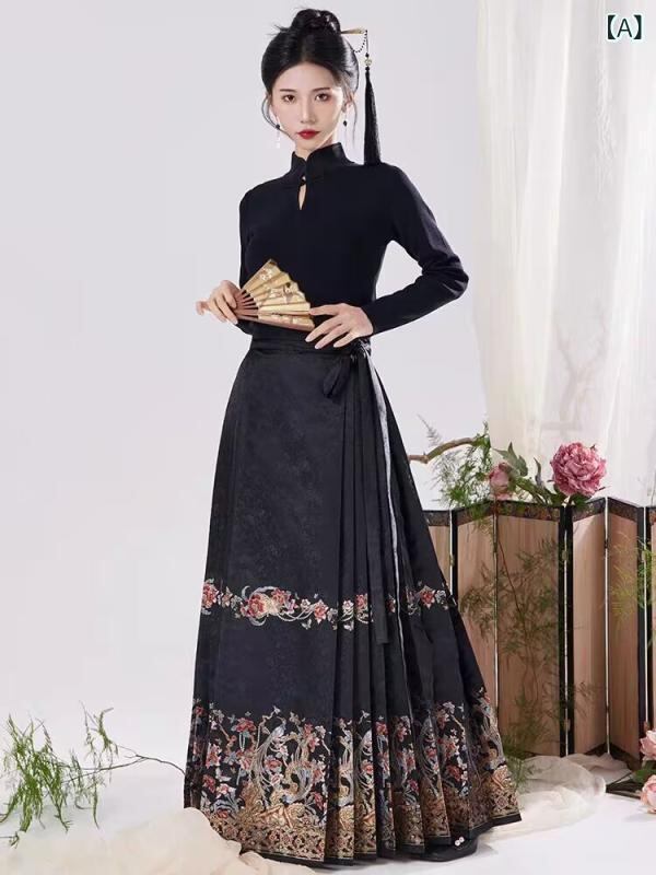 馬面スカート レディース 秋 冬 中華風 オリジナル 漢服 上品 エレガント 細見え ハイウエスト ロング丈 スリムフィット 黒色 無地 フォーマル カジュアル パーティー 普段使い | cybercart