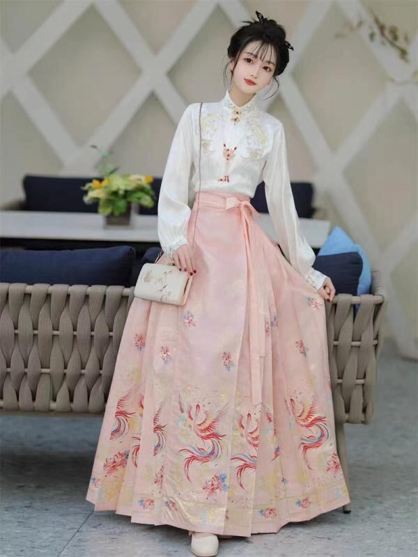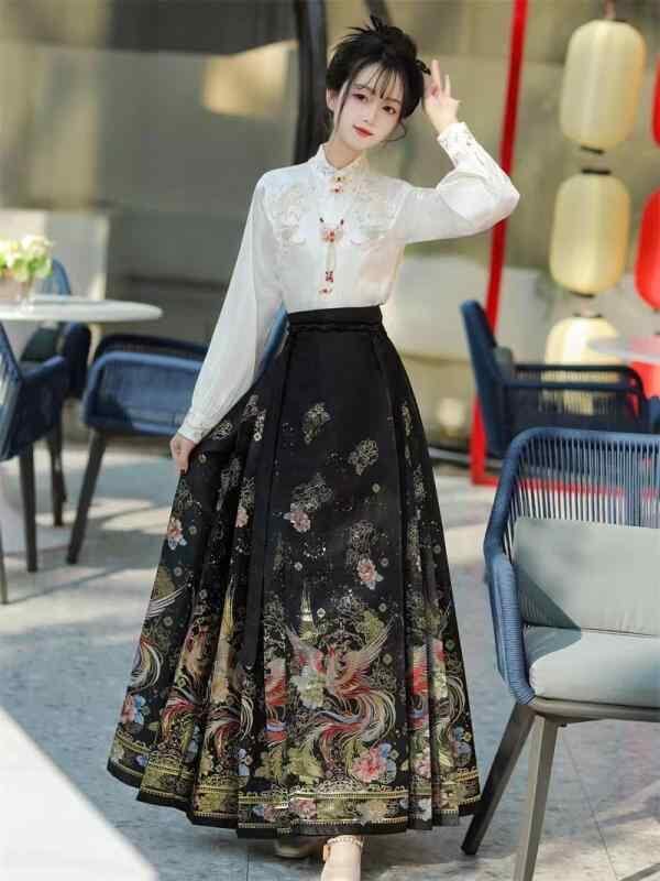 漢服 レディース 女性用 中華服 中国伝統衣装 馬面スカート プリーツスカート セットアップ 金糸織り 花模様 普段使い 宴会 パーティー 晴れ着 イベント