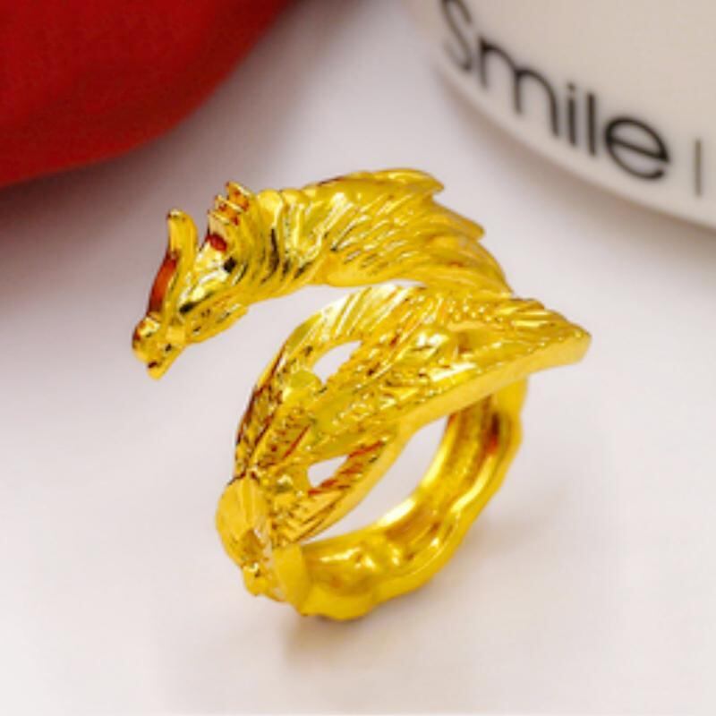 戒指 ユニセックス ペアリング カップルリング 龍 鳳凰 モチーフ 結婚 婚約 ブライダル ゴールド 金メッキ 縁起物 幸運 お守り サイズ調整可能 フリーサイズ オープンリング 銅製 幾何学デザイン