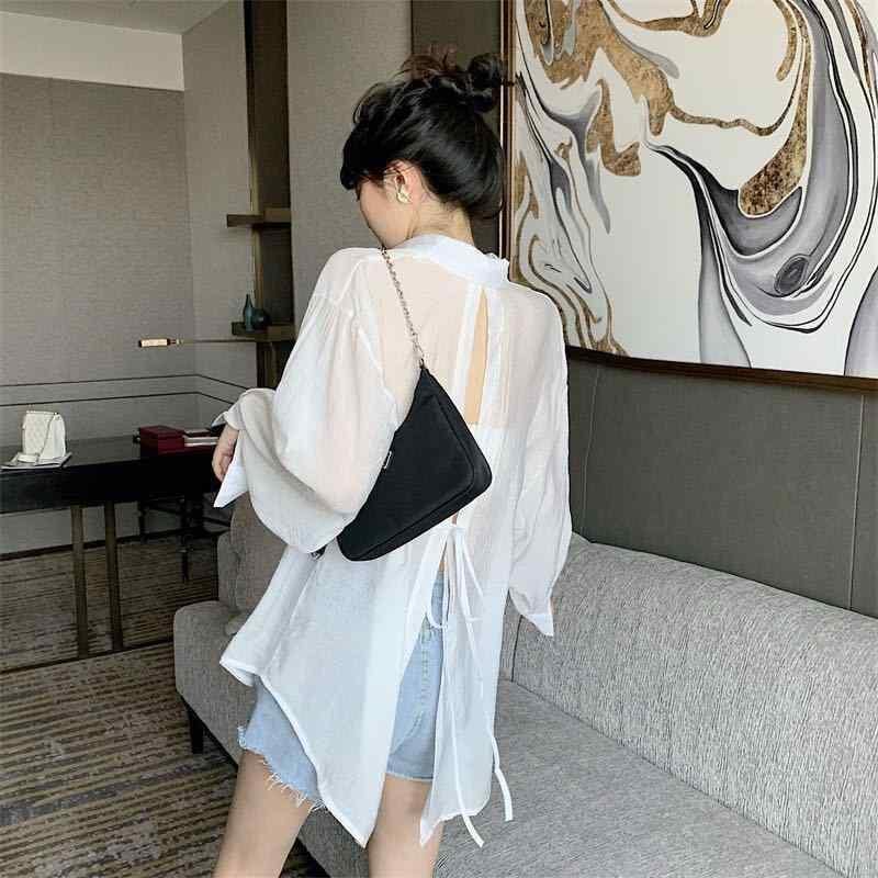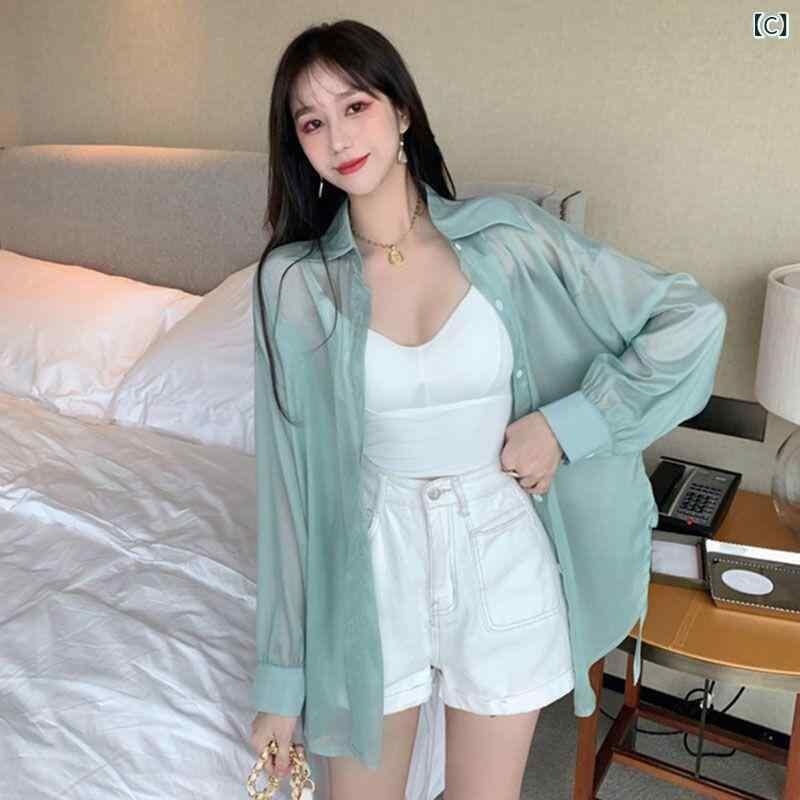 シフォンブラウス レディース おしゃれ シアー 薄手 UVカット ゆったり 長袖 ポロ襟 ミドル丈 無地 ポリエステル 羽織り 着回し 日常使い カジュアル ホワイト