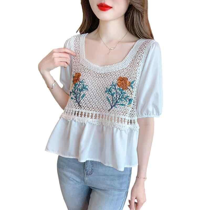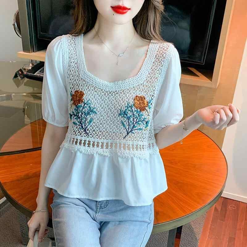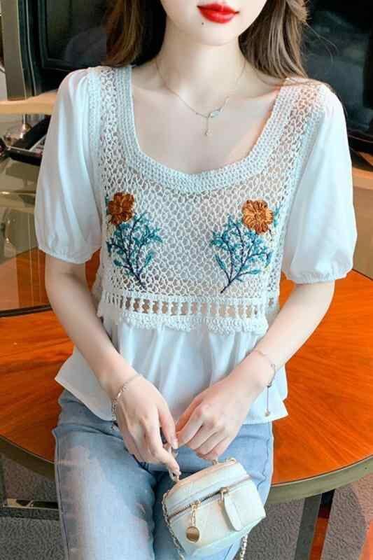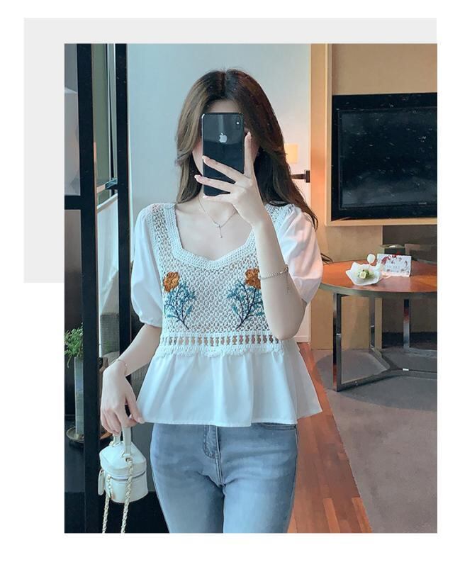 半袖ブラウス レディース 女性用 シアー シフォン アクリル ゆったり 薄手 透け感 刺繍 クロシェ かぎ針編み 花柄 スクエアネック ランタンスリーブ 五分袖 プルオーバー 上品 フェミニン 夏 普段使い 着回し デイリーユース ホワイト アイボリー