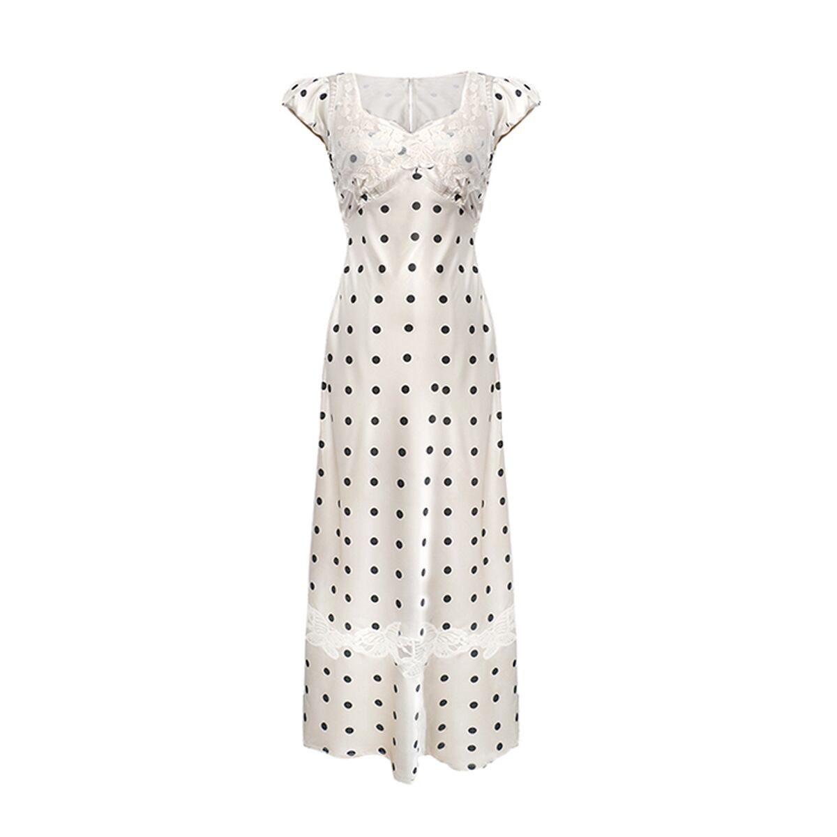 ワンピース レディース フレンチスタイル Vネック ノースリーブ ハイウエスト ウエストマーク ドット柄 Aライン ミディ丈 高級感 エレガント シフォン サテン調 ポリエステル オフホワイト 夏