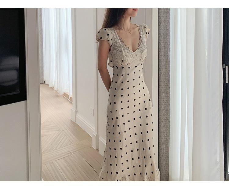 ・カテゴリ: ワンピース; ・スタイル: エレガント通勤; ・デザイン: キャミソール; ・主な素材: シフォン; ・素材構成: ポリエステル 30%〜50%未満; ・柄: ドット; ・セット内容: 単品; ・スカート丈: ミディ丈; ・スカートシルエット: タイト; ・ネックライン: Vネック; ・袖丈: ノースリーブ; ・ウエストタイプ: ハイウエスト; ・カラー展開: オフホワイト、マルチカラー; ・サイズ展開: S、M、L