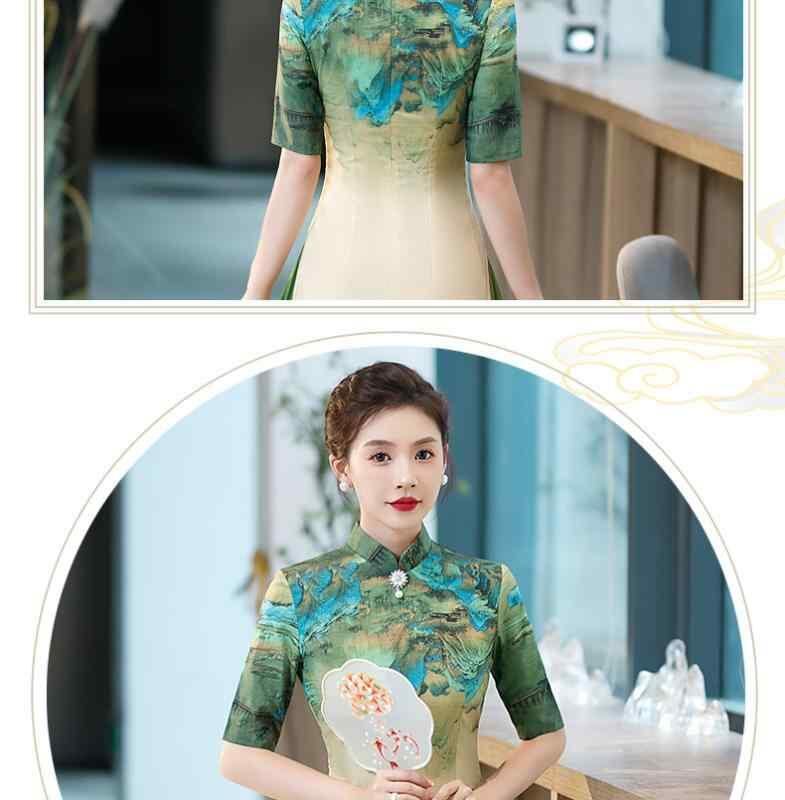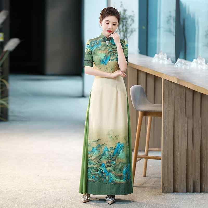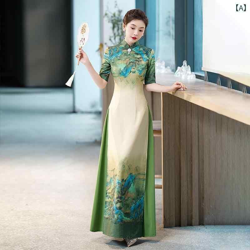 チャイナドレス レディース 改良デザイン 高級感 気品 エレガント ロング丈 ワンピース 立襟 五分袖 ボタン装飾 スリット入り 大きいサイズ ゆったり 大人上品 フォーマル パーティー チャイニーズスタイル オフホワイト