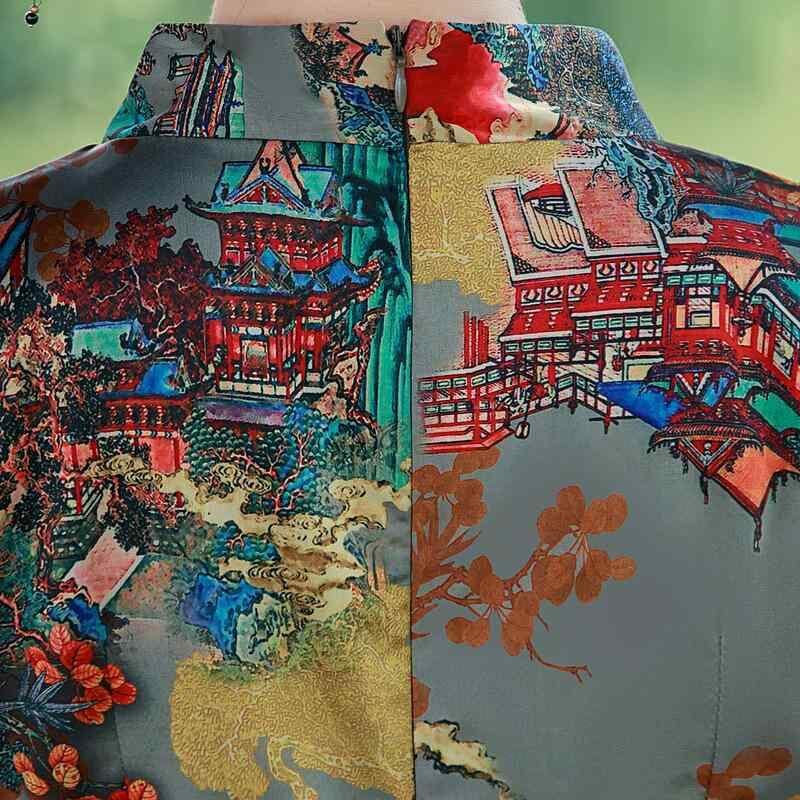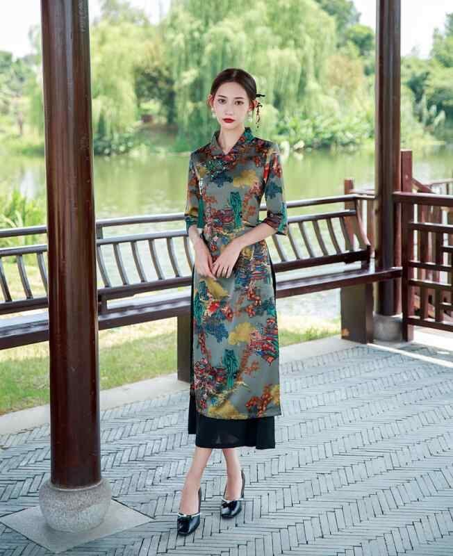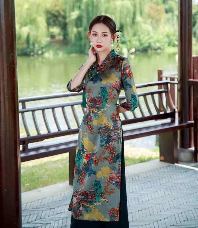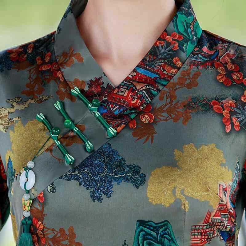 チャイナドレス レディース チャイナ風 ロング丈 マキシ丈 立ち襟 スタンドカラー 斜め襟 七分袖 7分袖 ポリエステル シルク調 光沢感 リゾートスタイル バカンス 旅行 お出かけ きれいめ エレガント 上品 大人かわいい 大人女子