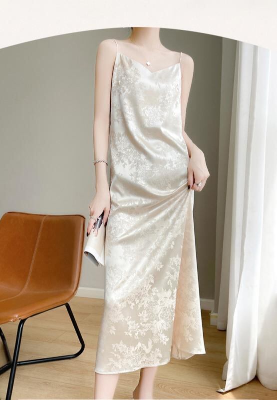 ワンピース レディース 接触冷感 Vネック ジャカード織り ノースリーブ キャミソール ロング丈 通勤 オフィス スレンダー 細見え Aライン 無地 エレガント 上品 ホワイト シャンパン ブラック