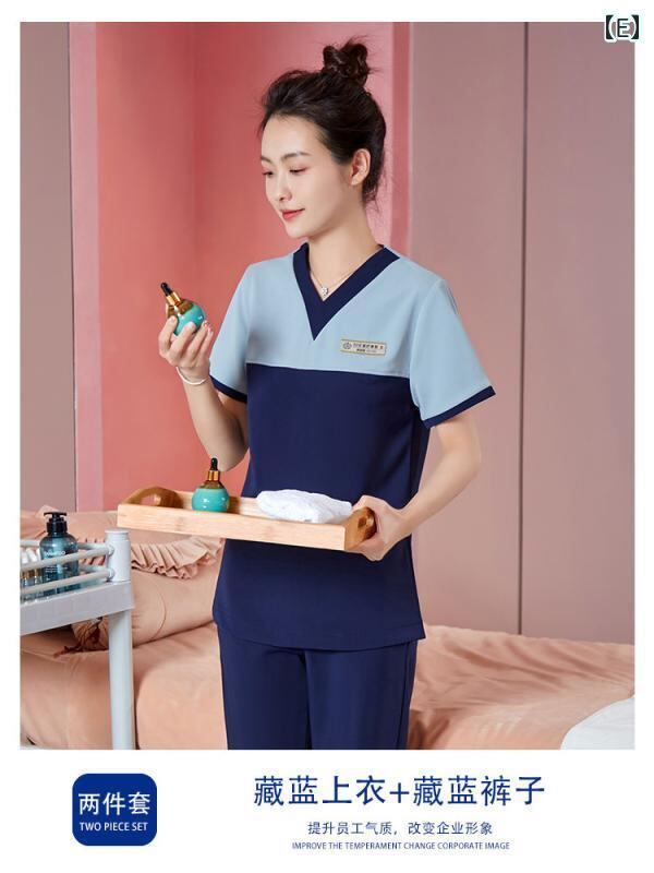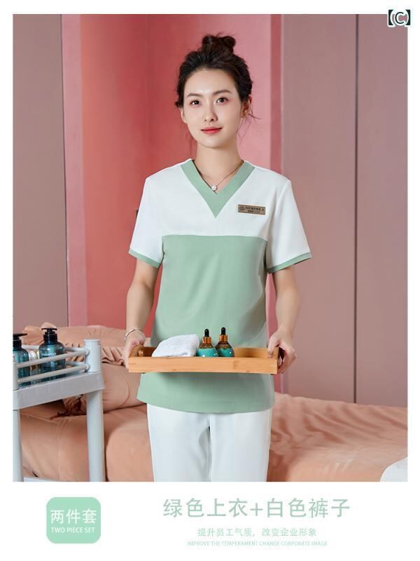 制服 レディース パンツスーツ セットアップ エステティシャン サロン ホテル フロント 受付 マッサージ セラピスト ユニフォーム 上品 エレガント 高級感 撥水 防汚 ストレッチ Vネック 半袖 ポリエステル オールシーズン