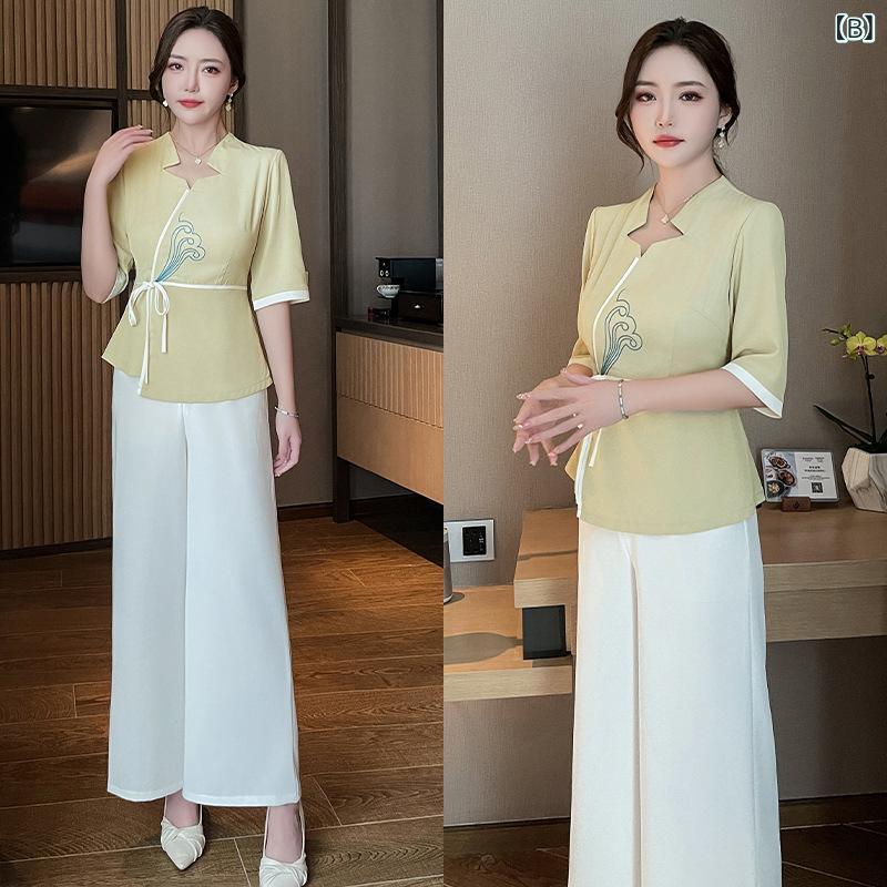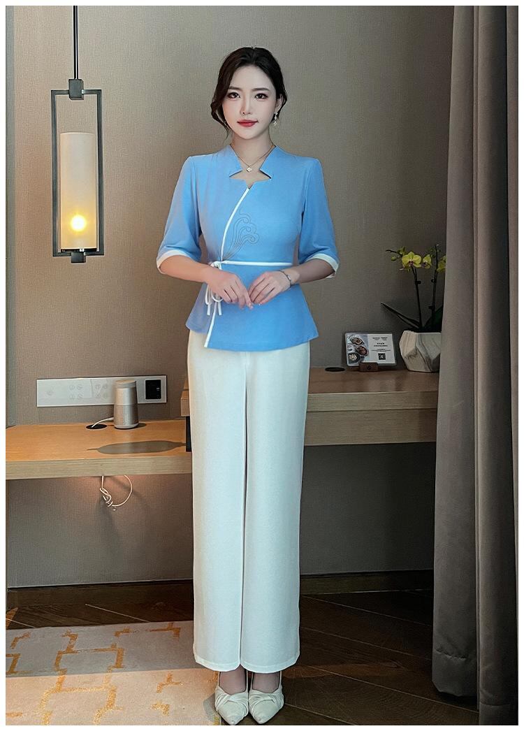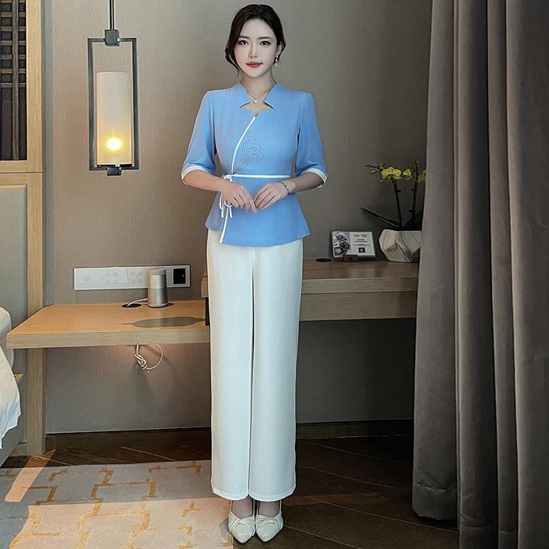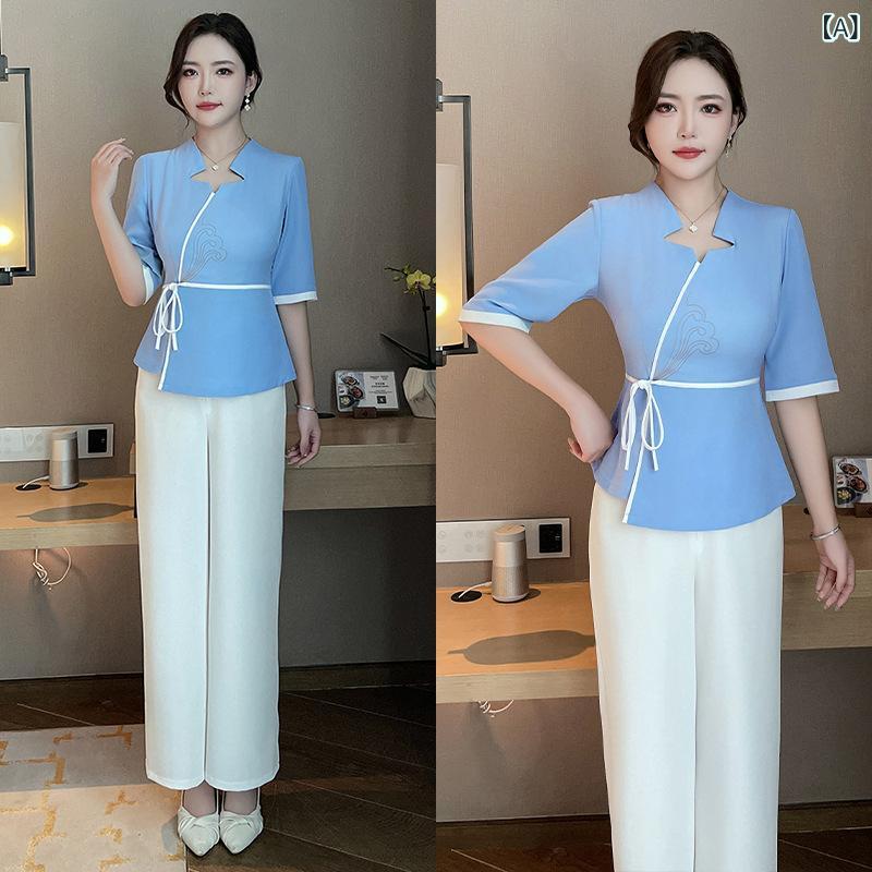 制服 レディース フットケア エステ マッサージ 施術着 ワークユニフォーム ロングパンツ セットアップ Vネック 半袖 吸湿速乾 ポリエステル 細見え効果 スパ リラクゼーション 美容院 ホテル 快適 ウェア