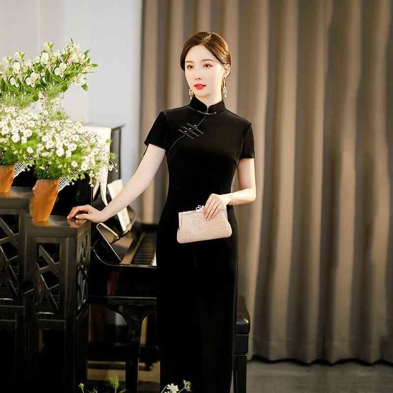 旗袍 レディース 高級感 ベロア ブラック ミモレ丈 七分袖 ゆったり 大きいサイズ 小柄向け デイリーユース 日常着 レトロモダン 改良タイプ スタンドカラー 斜め襟 スリット