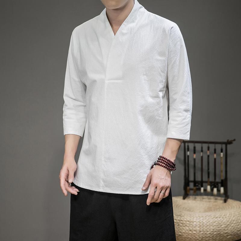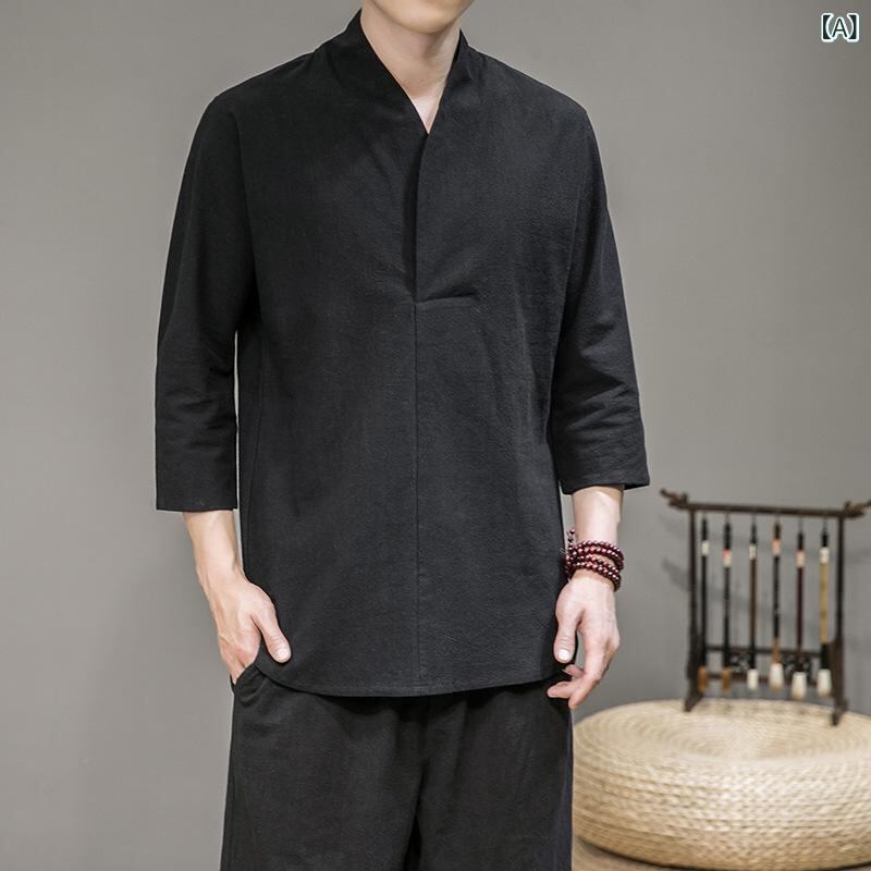 Tシャツ メンズ 男性用 中華風 チャイニーズスタイル 綿麻素材 リネン混 七分袖 ゆったり ビッグシルエット 大きいサイズ カジュアル 普段使い 夏物 涼しい 吸湿速乾 ブラック ブルー